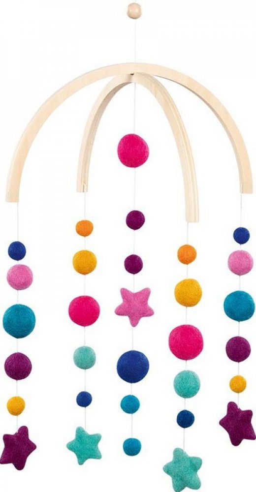 Závěsná dřevěná dekorace například nad dětskou postýlku. Ležící miminko pozoruje pohyb kuliček. Jsou to první známky soustředění a zaostřování na konkrétní předmět. Závěsný kolotoč do dětského pokoje potěší miminka i malé děti při usínání a ozdobí dětský pokojíček. Hvězdičky a malé planetky na tomto kolotoči jsou vyrobeny z vlněného filce ze 100% férově obchodované vlny. Krásné barvičky, při kterých se bude dětem dobře usínat, třeba za vyprávění pohádkového příběhu. Vyrobeno z kvalitní překližky a vlny.