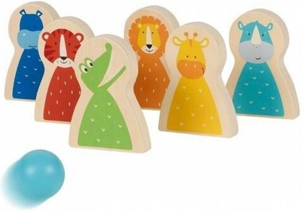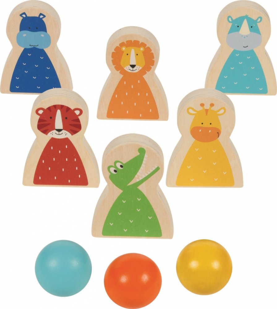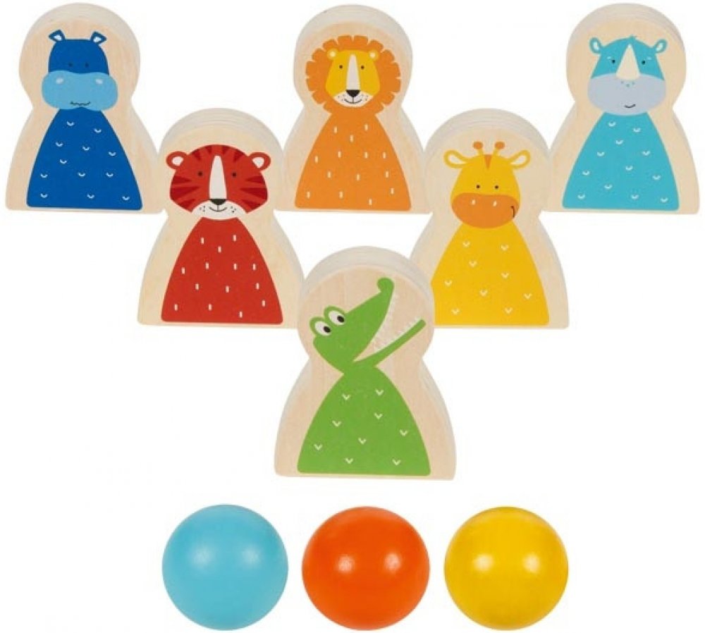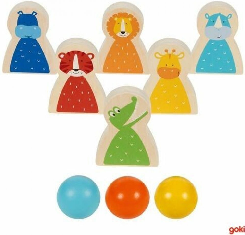 Kuželky z masivního dřeva se zvířátky lze hrát téměř kdekoli a kdykoli během roku. Na zahradě, na rovné písečné cestě, na terase, na stole nebo třeba v předsíni se šest barevných dílků rychle složí a hra v kuželky může začít. Hru si můžete přizpůsobit vlastním pravidlům. Můžete zvířátka různě obléknout, uspořádat soutěž o to, kdo jako první porazí krále zvířat, a můžete vymyslet mnoho dalších způsobů, jak hru oživit. Rozměry: Výška kužele 8,5 cm, koule ? 4 cm. GOKI je jedním z nejvýznamnějších evropských výrobců hraček s vysokou vzdělávací a didaktickou kvalitou. Společnost klade velký důraz na bezpečnost hraček, jejich zdravotní nezávadnost a ochranu obnovitelných zdrojů. Dřevo je odebíráno z míst, kde může růst. Používají se dřeva javoru, buku, ořechu, lípy, jasanu, borovice, břízy a kaučukovníku. Barvy a laky pocházejí od menších výrobců. GOKI Skittles - Divoká zvířata
