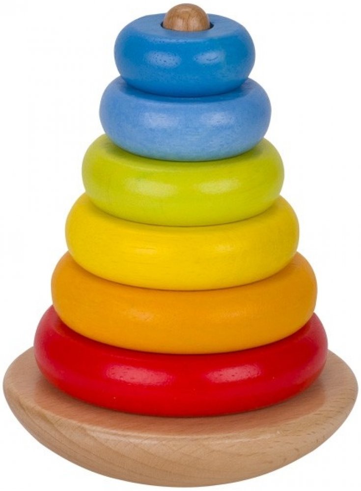 Krásná jednoduchá zaoblená stohovací věž, která je velká tak akorát pro dětské ruce.Pestré barvičky a příjemně lazurované dřevo, to je ten správný začátek pro vstup do světa stavění. Celá pyramida má výšku 12 cm a je vhodná pro děti od 2 let (děti ale zajímá v období 11 - 13 měs.)