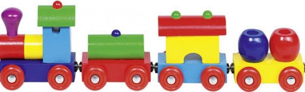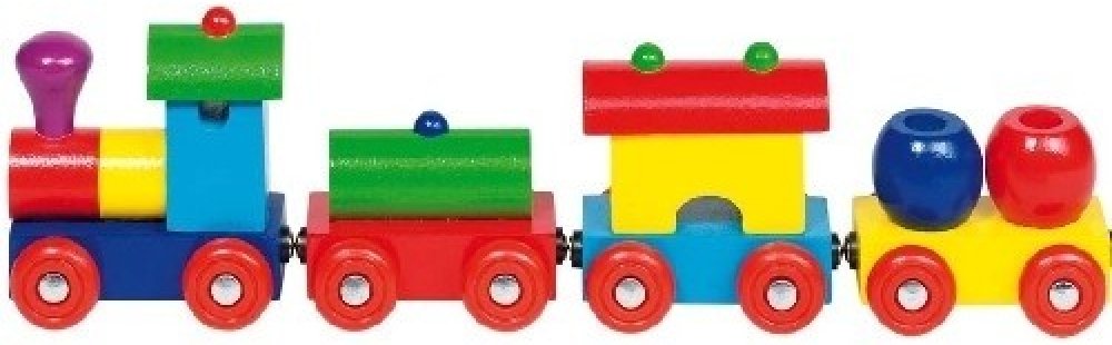 Dřevěný vláček, krásně barevný, vagónky jsou spojené magnetem