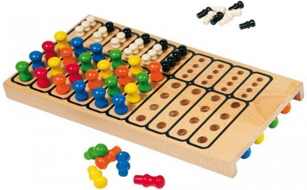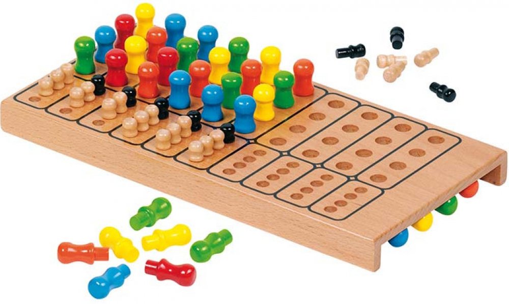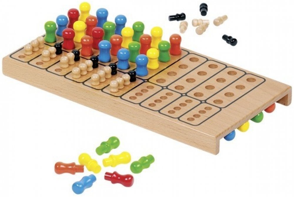 Obsahuje: základní desku (21 x 12 x 2,4 cm), větší figurky v 5 barvách, menší figurky ve 2 barvách, návod.