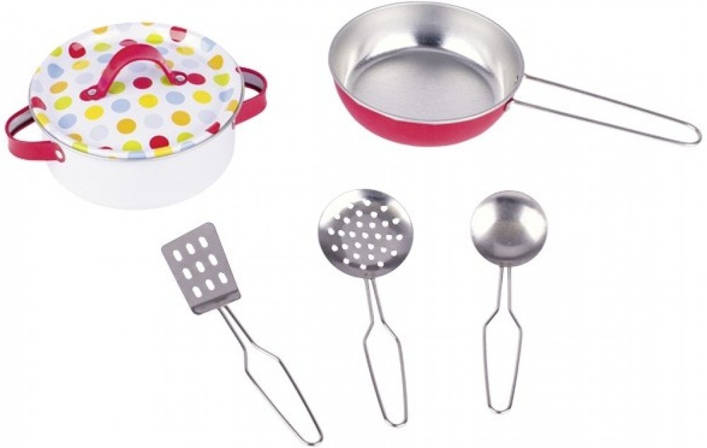 Nádobí do kuchyňky s puntíky, 6 dílků. Kuchyňský set obsahuje nádobí z kovu. Nádobí je vhodné pro dětské vaření. Děti tak mohou společně s rodiči připravovat spoustu pokrmů a používat stejné nádobí jako oni.