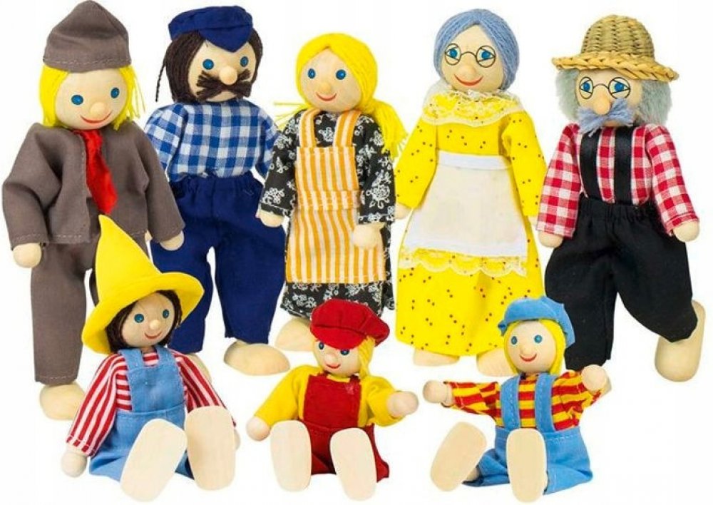 Sada 8ks dřevěných panenek do domečků - děda, babička, máma, táta, 2 děti a 2 pomocníci
