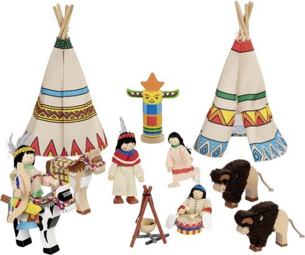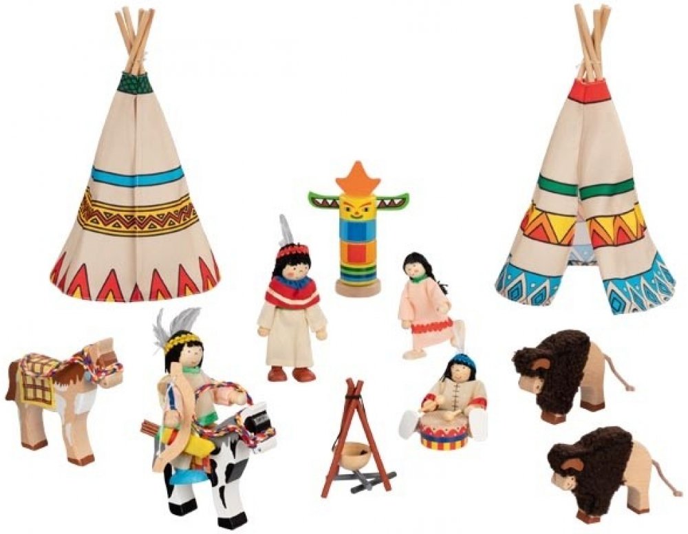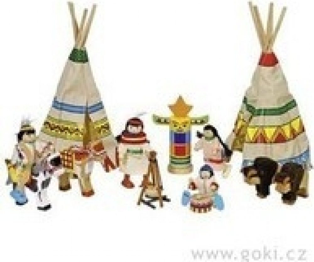 Pěkná kompletní indiánská osada, která zaujme každého malého kluka, který má rád indiány. Osada pro malé indiány obsahuje čtyři panenky s ohebnými končetinami, indiánské doplňky, dva koně, dva bizony, totem, ohniště, buben a dvě týpí. Panenky jsou vyrobeny z kvalitního dřeva a drátu, oblečky jsou z různých druhů textilií. Tyto dřevěné hračky jsou edukativní, podporují fantazii a inspirují. S panen...