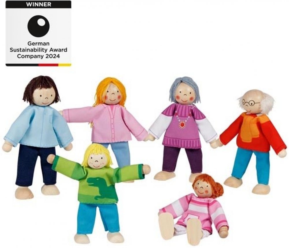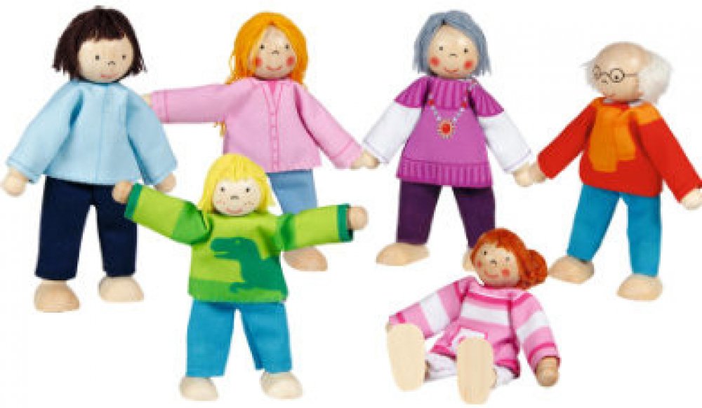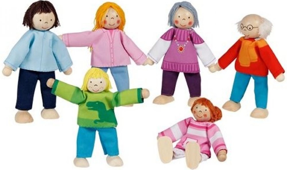 Panenky do domečku Do každého domečku pro panenky patří rodina, která v něm bude bydlet. Třígenerační rodinka panenek nabízí dětem bohaté možnosti hry. Rodiče, prarodiče i děti jsou vyrobeni ze dřeva a textilu, nosí moderní oblečení a jsou lehce ohební. Panenky můžete kombinovat s ostatními panenkami do domečků. Technické parametry rozměry: výška panenek 9 - 11 cm
