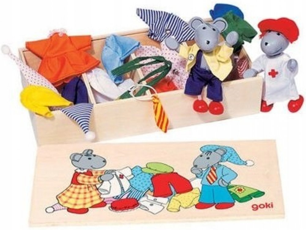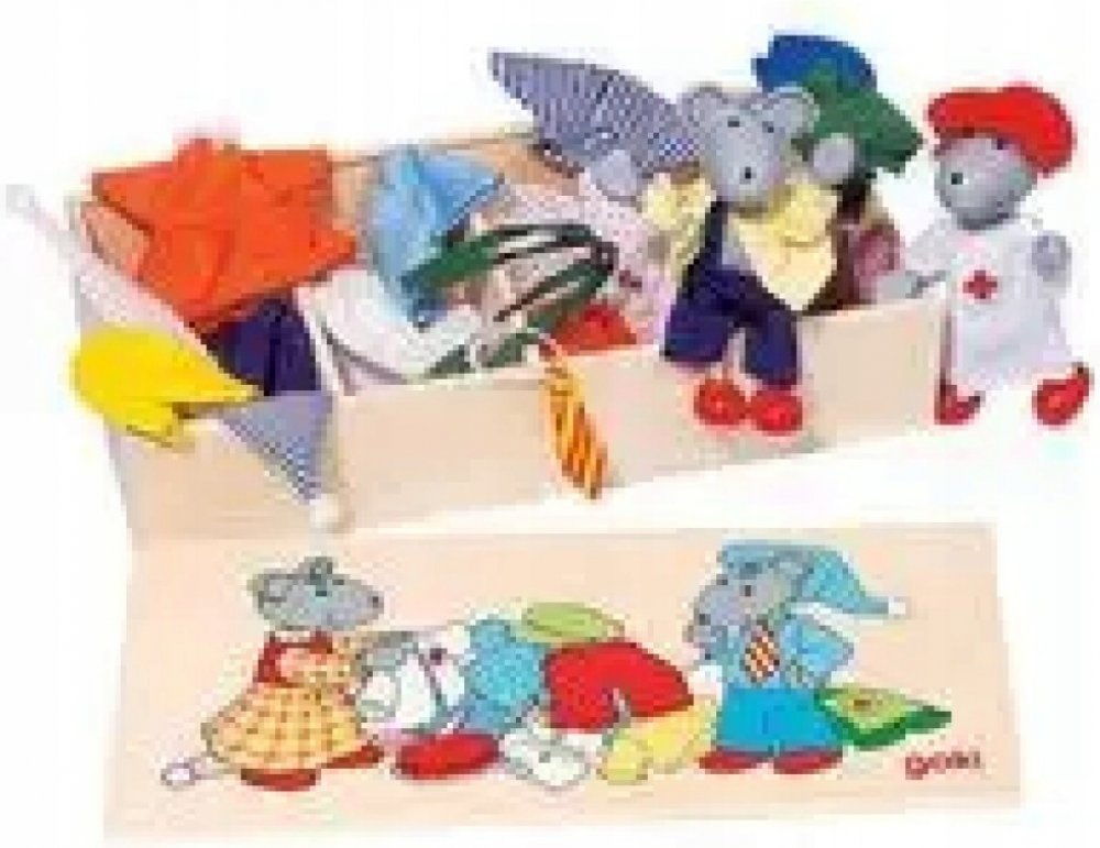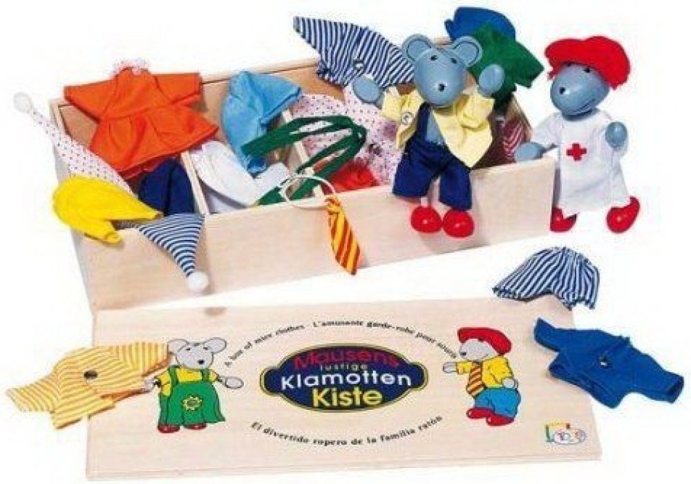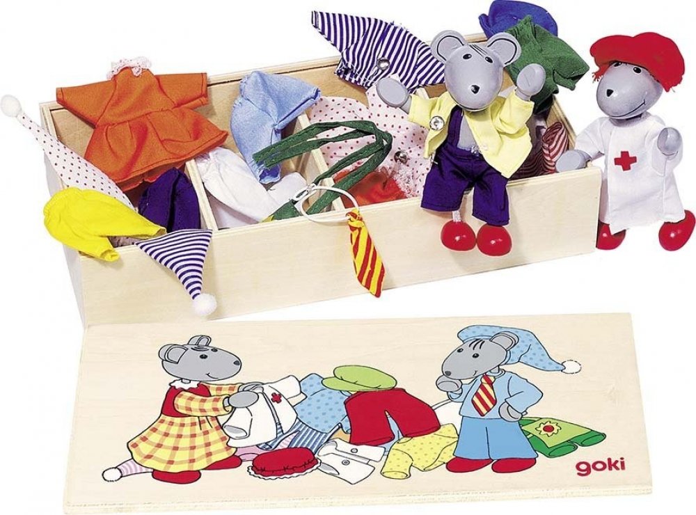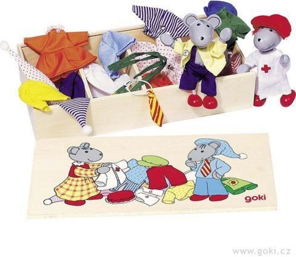 Set se 2 myškami a 8 různými látkovými oblečky na převlékání. Knoflíčky na šatech slouží k procvičování jemné motoriky malých dětských prstíků. Lze použít i do domečků. Myšky jsou ohebné. Celá sada je dodávána v praktické dřevěné krabičce s uzavíratelným víkem.