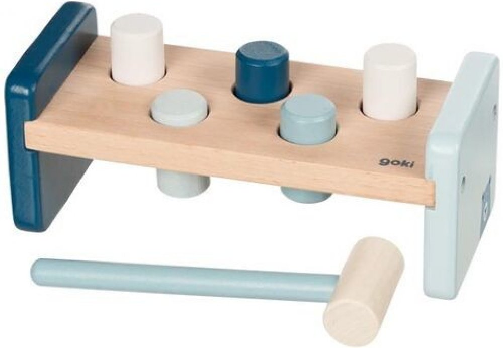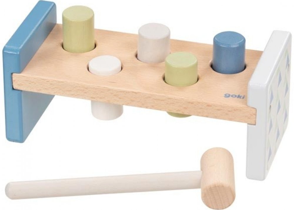 Dítě při hře zatlouká dřevěné kolíky do otvorů v desce.
