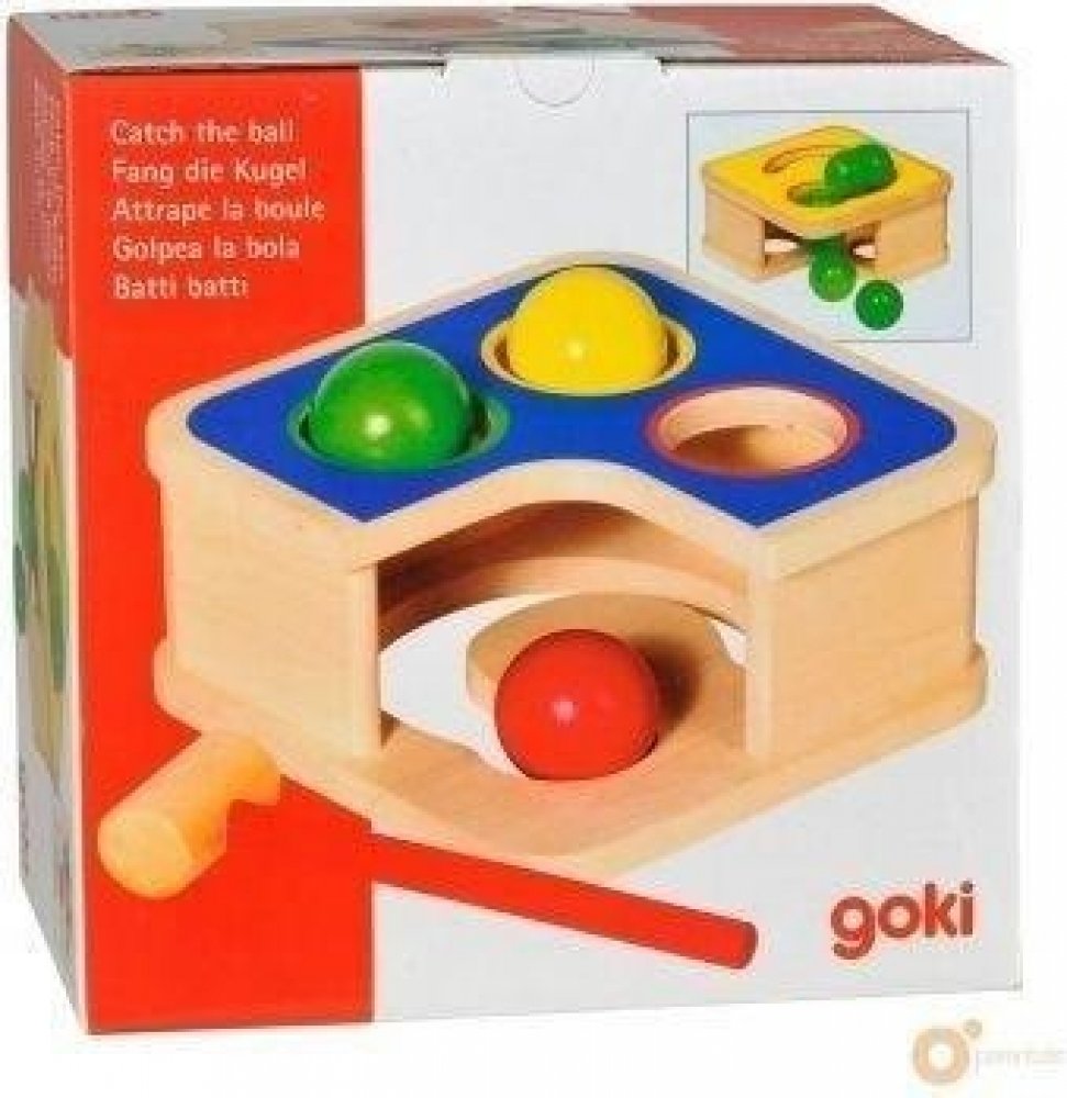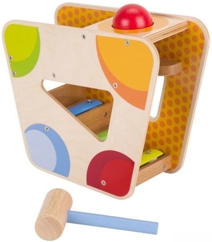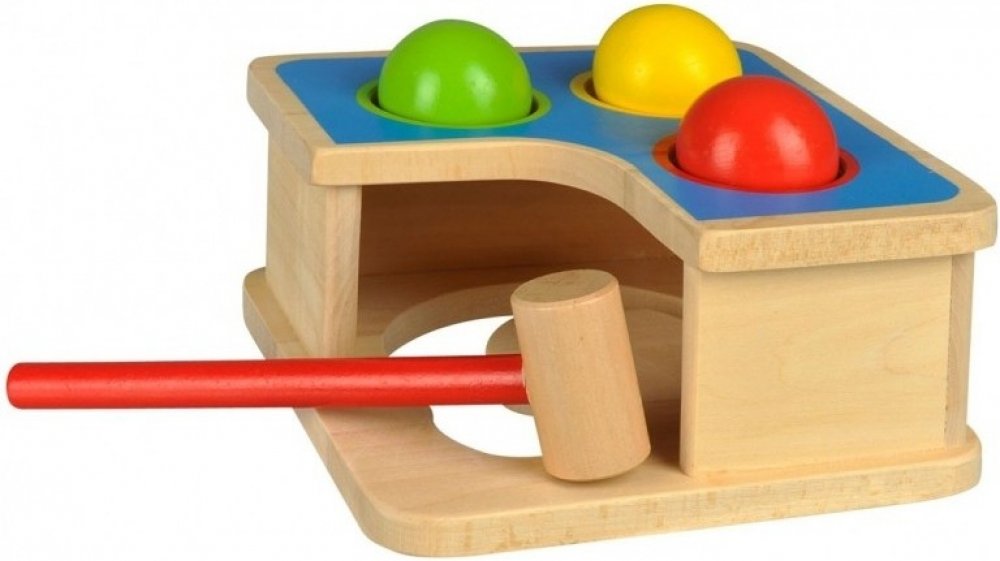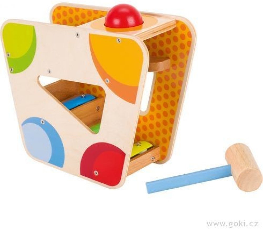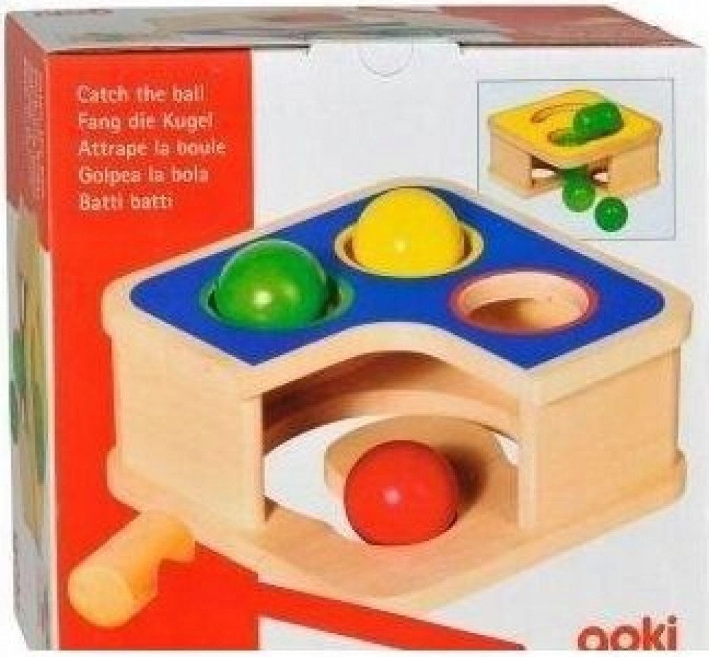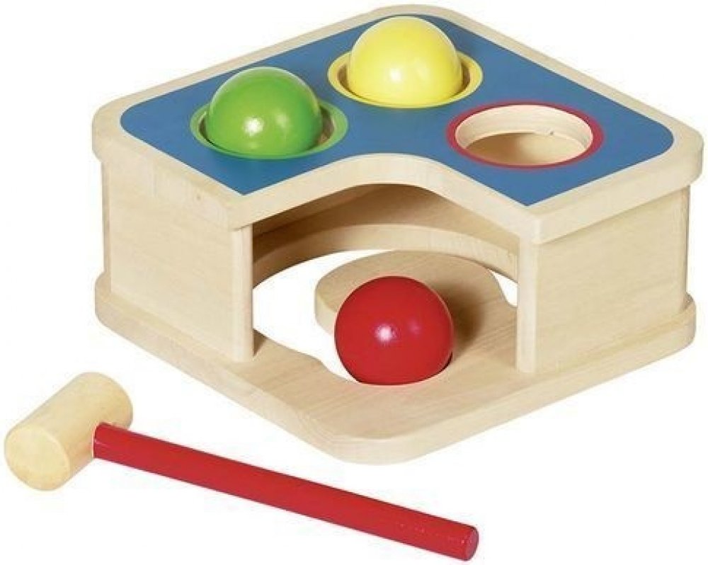 Velmi zajímavá inovace klasické zatloukačky pro malé i větší děti! Z jedné strany je to klasická zatloukačka se třemi barevnými koulemi. Otočte ji vzhůru nohama a uvidíte, jak se koule valí po dráze a otvorem se dostanou ven. Kombinace zatloukání a pozorování koulí na kuličkové dráze děti baví opravdu dlouho. Šikovná pomůcka pro procvičování motoriky, přesnosti a koordinace oko-ruka.