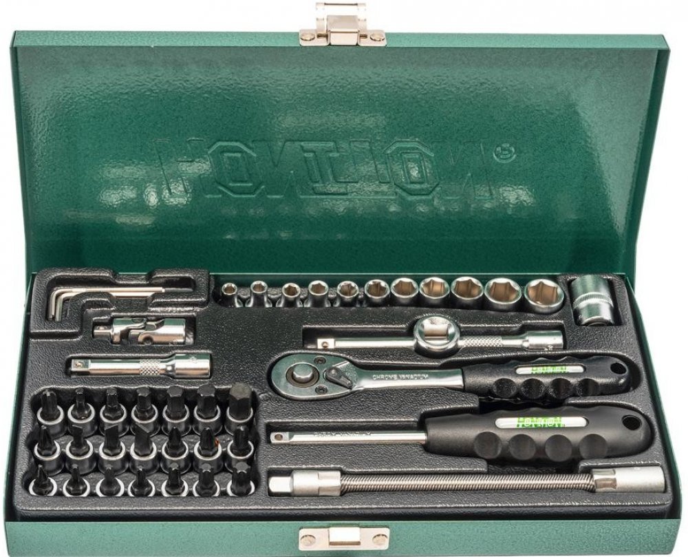 Technická dataHlavice nástrčné 1/4":4, 4.5, 5, 5.5, 6, 7, 8, 9, 10, 11, 12, 13 mmRedukce:1/4"-3/8"Hlava na vratidlo:1ksRáčna:1/4" (36T)Nástavec:1/4": 50, 100 mmNástavec s rukojetí:1/4“Kardan:1/4“Nástavec pružinový:1/4“Hlavice zástrčné 1/4":PH1, PH2, PH3; PL4, PL5.5, PL7; PZ1, PZ2, PZ3; IMBUS: 3, 4, 5, 6, 7, 8 mm; TRX: T10, T15, T20, T25, T30, T40Klíče:IMBUS: 1, 1.5, 2 mmNorma:DIN 3124