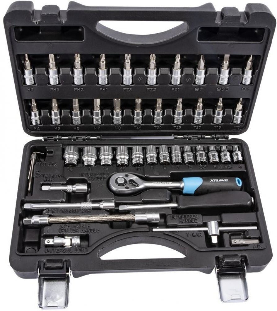 Technická dataHlavice nástrčné 1/4":4, 4.5, 5, 5.5, 6, 7, 8, 9, 10, 11, 12, 13, 14 mmHlavice zástrčné 1/4":PH1, PH2, PH3; PZ1, PZ2, PZ3; PL4, PL5.5, PL7; IMBUS: 3, 4, 5, 6, 7, 8 mm; TRX: T10, T15, T20, T25, T30, T40Ráčna:1/4" (72 zubů)Nástavec:1/4“: 50, 100 mmNástavec s rukojetí:1/4"Nástavec pružinový:1/4"Kardan:1/4"Vratidlo:1/4"Klíče:IMBUS: 1.5, 2, 2.5 mmAdaptér na bity:1/4"Materiál:CrV 50 (50BV30)Norma:DIN 3124: standardní hlavice; DIN 3122: ráčnyProdejní obal:krabice