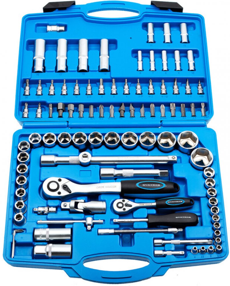 Metrická gola sada s nářadím, vodicí čtyřhrany 1/4” (6,35 mm) a 1/2” (12,8 mm), 94 ks nářadí v plastovém kufru – QUATROS QS50094 Kompaktní a účelově poskládaná „golovka“ s ideálním poměrem mezi rozsahem a cenou. Obsahuje nejčastěji používané druhy nářadí, které jsou v autoservisu, dílně nebo při domácích pracích zapotřebí. Kvalitní produkt: vyrobeno z chrom-vanadové (Cr-V) oceli, ráčny a šroubovák...