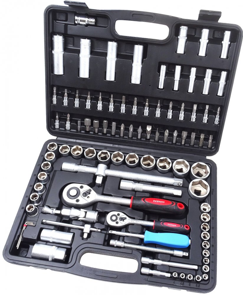 Gola sada o rozměrech 1/4“ a 1/2“, 94 ks nářadí – GEKO G10150 Souprava nářadí v kufru, celkem 94 dílů nářadí, ideální pro každého domácího kutila. Vyrobeno z chrom-vanadové oceli. Hobby vybavení; sada není vhodná pro rázové utahováky. Gola sada je dodávána v praktickém kufru z tvrdého plastu. Souprava obsahuje: - nástrčné hlavice (ořechy) 1/4”: 4 – 4.5 – 5 – 5.5 – 6 – 7 – 8 – 9 – 10 – 11 – 12 – 13...