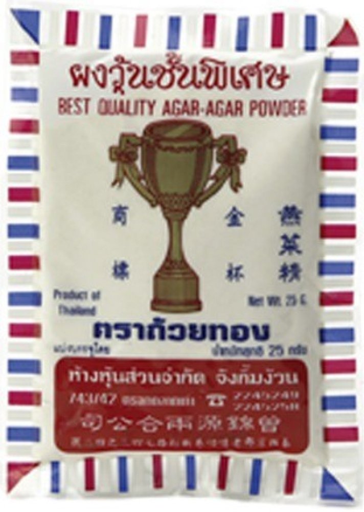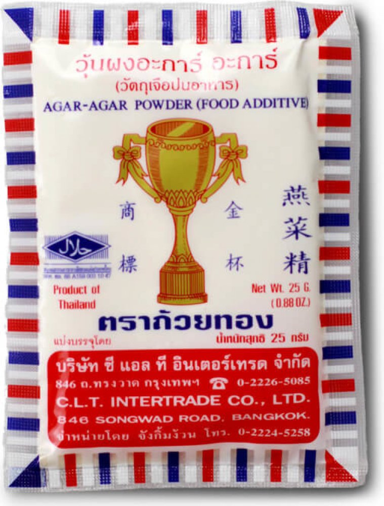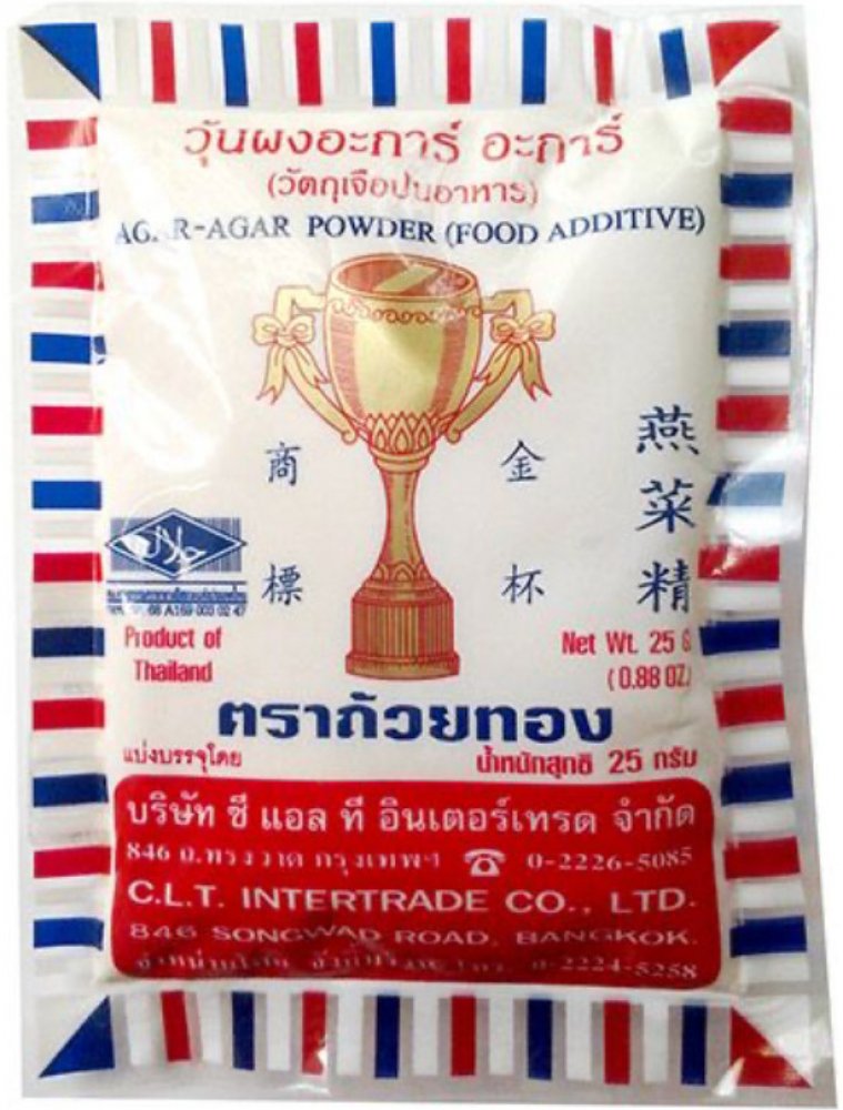 Složení: Agarový prášekVýživové hodnoty/100 g výrobku: energetická hodnota 695 kJ/173 kcal, tuky 0 g, z toho nasycené mastné kyseliny 0 g, sacharidy 1,8 g, z toho cukry 0 g, bílkoviny 0 g, sůl 1,3 g.Příprava: Pro přípravu želé použijte 4 g prášku na 100 ml tekutiny. Pro přípravu džemu nebo marmelády se obvykle přidává 15 g na 1 kg ovoceVšechny výrobky jsou distribuovány v souladu s místními a mezinárodními normami, což zákazníkům zaručuje bezpečné, účinné a spolehlivé produkty. Společnost se rovněž zavázala dodržovat přísnou politiku ochrany osobních údajů, která zaručuje důvěrnost a bezpečnost všech informací poskytnutých zákazníky.Adresa: 39/10-11 Moo 3, Sukhumvit Road, Bangpoo Industrial Estate, Samut Prakan 10280, Thajsko