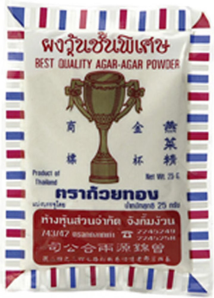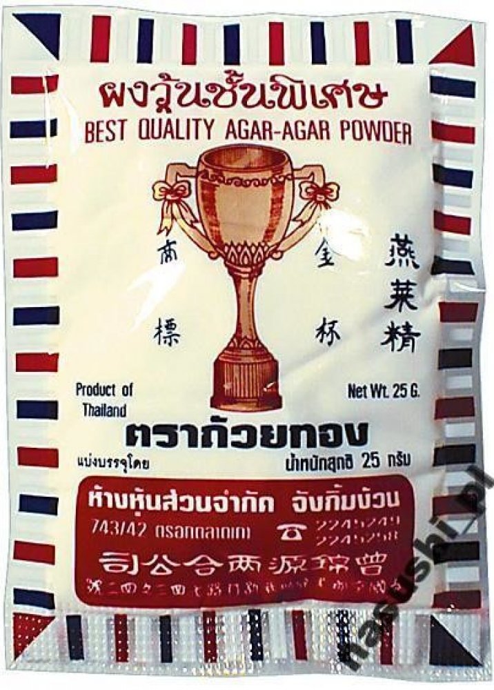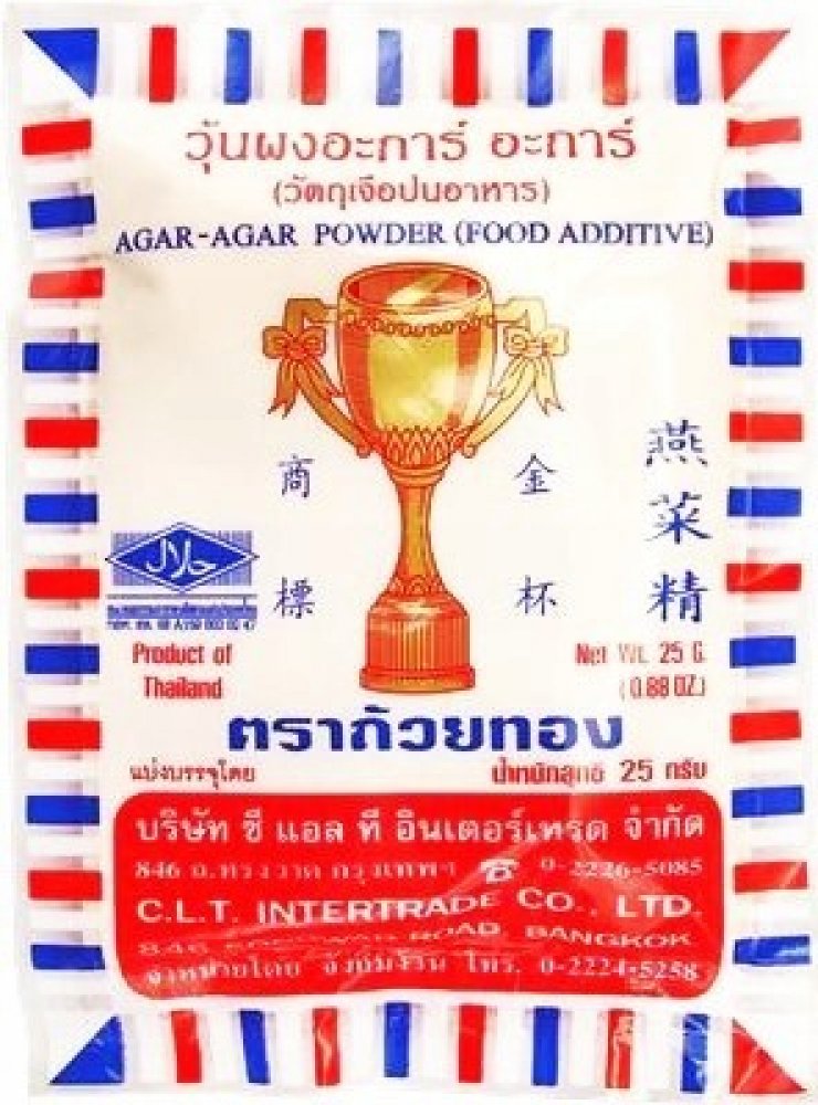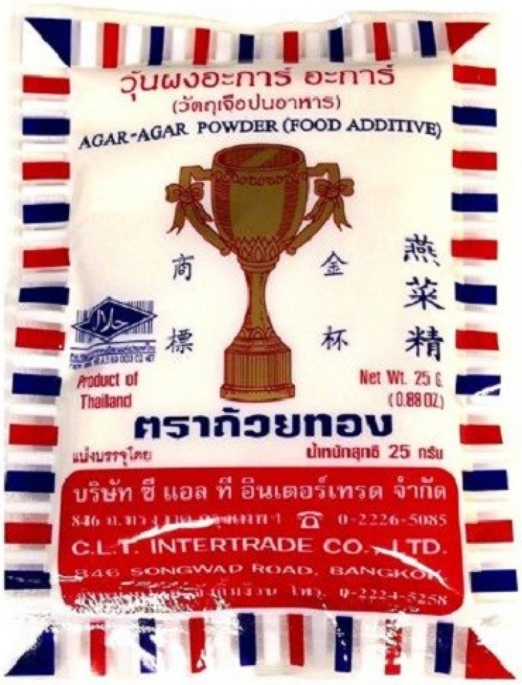 Agar agar - želírující látka v prášku rostlinného původu (polymer galaktózy), bezbarvá, bez chuti a zápachu. Získaná z červených řas Sphaerococcus euchema nebo rodu Gelidium. Želí již pod 40 °C a rozpouští se až tempem. 85°C. Agar v prášku se používá ve stejném poměru, a ke stejnému účelu jako želatina v prášku. Příprava: nasypte do vody, zamíchejte a nechte 5 min. působit, poté vařte a ...
