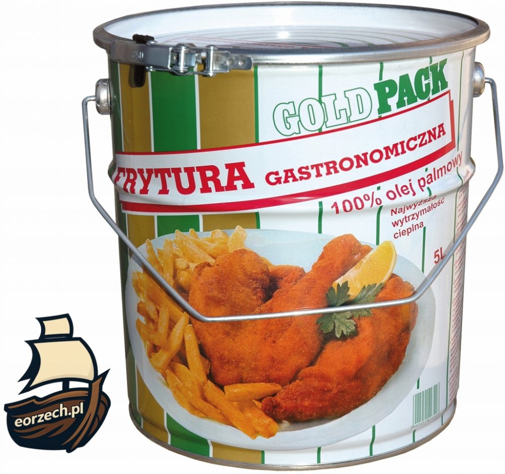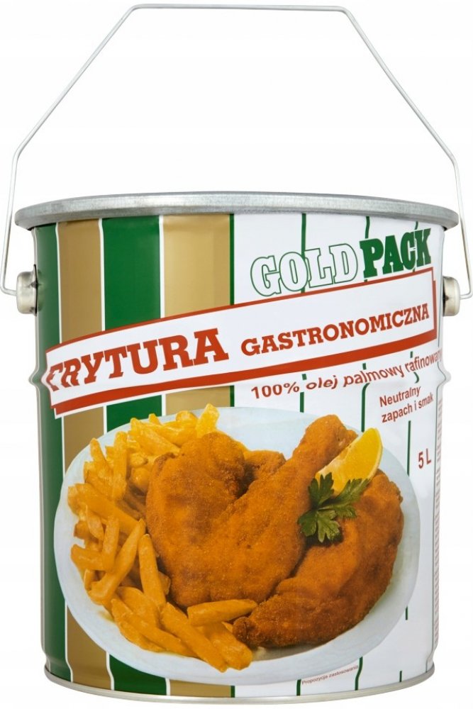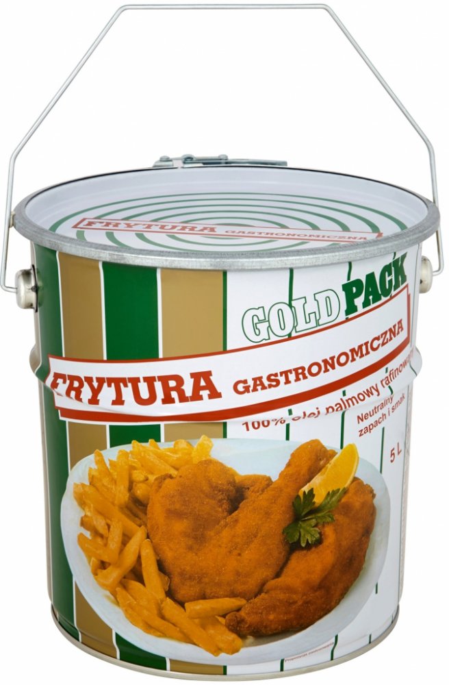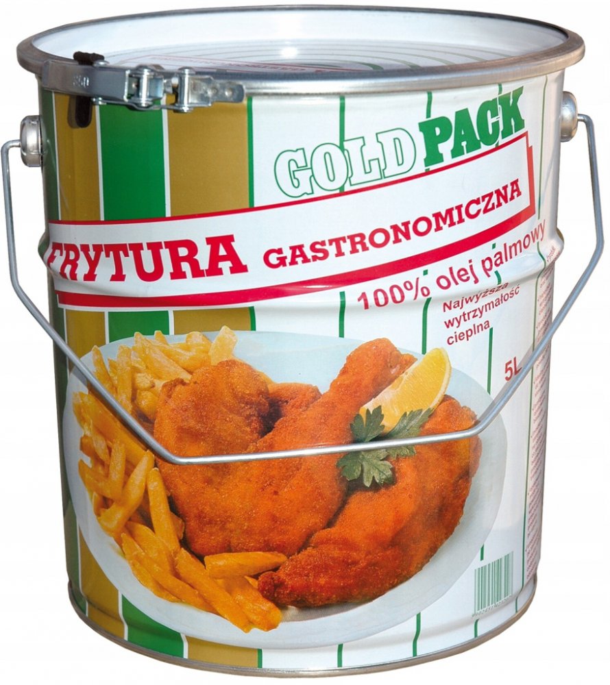 GoldPack gastronomická fritéza 100% palmový olej. Fritéza se vyznačuje vysokou pevností te-nou. Je ideální pro hluboké smažení - maso, hranolky nebo koblihy - určeno j pro opakované použití. Výrobek má vysoký obsah provitaminu A a karotenu. Praktický plechový obal lze po použití znovu použít k uložení výrobku a plechovka kbelíku uzavíratelná na ráfek je zárukou bezpečnosti výrobku při přepravě. Vlastnosti 100 % palmový olej rafinovaný. Gastronomická fritéza má přirozenou chuť a vůni, aniž by změnila chuť připravených pokrmů. Je ideální pro použití v každé kuchyni a gastronomickém průmyslu.