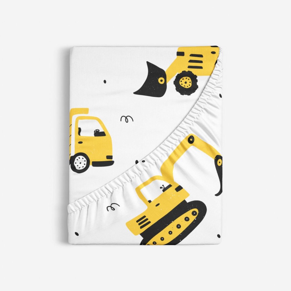 Prostěradlo s motivem bagrů a stavebních aut pro budoucí stavitele, kteří nechtějí před spaním počítat ovečky. Toto bavlněné prostěradlo (s napínací gumou) je vyrobeno ze 100% hladké bavlny o gramáži 145 g/m2. Podkladem prostěradla je bílá barva.