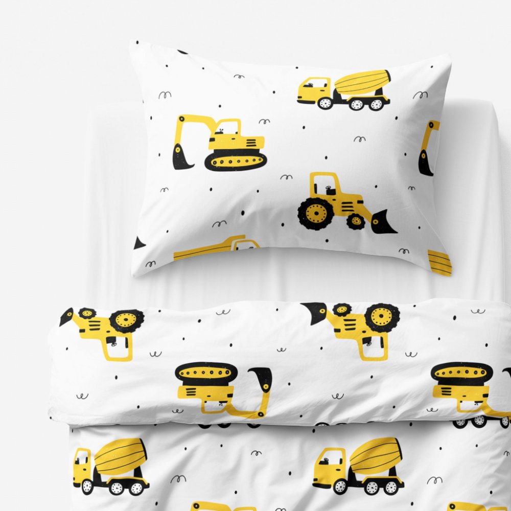 Povlečení s motivem bagrů a stavebních aut pro budoucí stavitele, kteří nechtějí před spaním počítat ovečky. Toto bavlněné povlečení je vyrobeno ze 100% hladké bavlny o gramáži 145 g/m2. Podkladem povlečení je bílá barva.