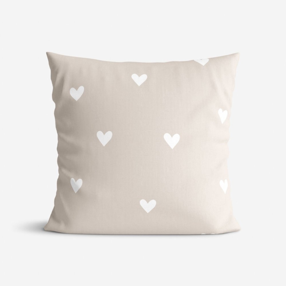 Bavlněný povlak na polštář s motivem bílých srdíček na latte podkladu (z obou stran stejný motiv). Povlak je vyroben z kvalitní a příjemné 100% bavlny. Je opatřen praktickým zapínáním na zip.