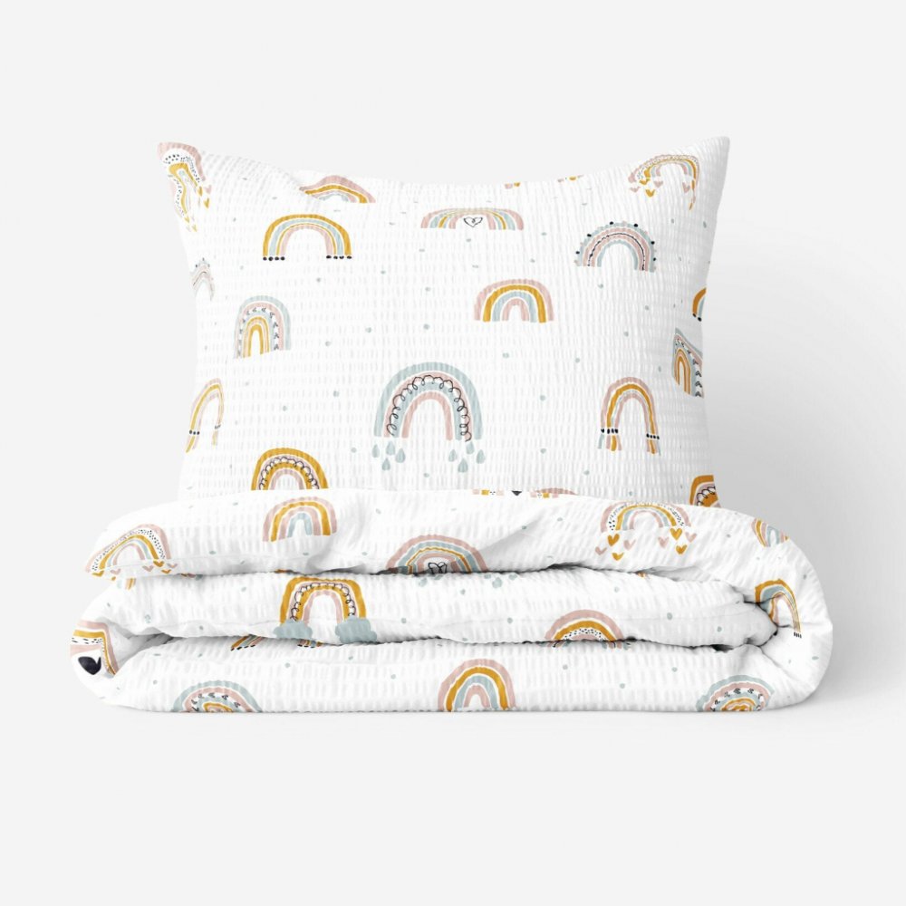 Povlečení s motivem barevných malovaných duh vykouzlí úsměv na tváři vašim dětem a bude krásnou ozdobou dětské postele. Podkladem povlečení je bílá barva.