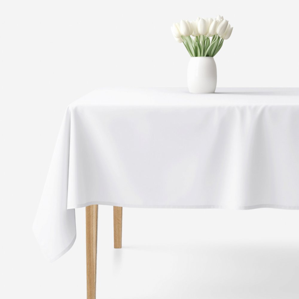 Bavlněný ubrus v bílé barvě. Je vyrobený z velmi pevné 100% bavlny (gramáž 200g/m2). Ubrus velmi dobře drží tvar a hodí se na jakýkoliv hranatý stůl (obdélníkový nebo čtvercový). Ubrus v bílé barvě dokonale zkrášlí Váš interiér.