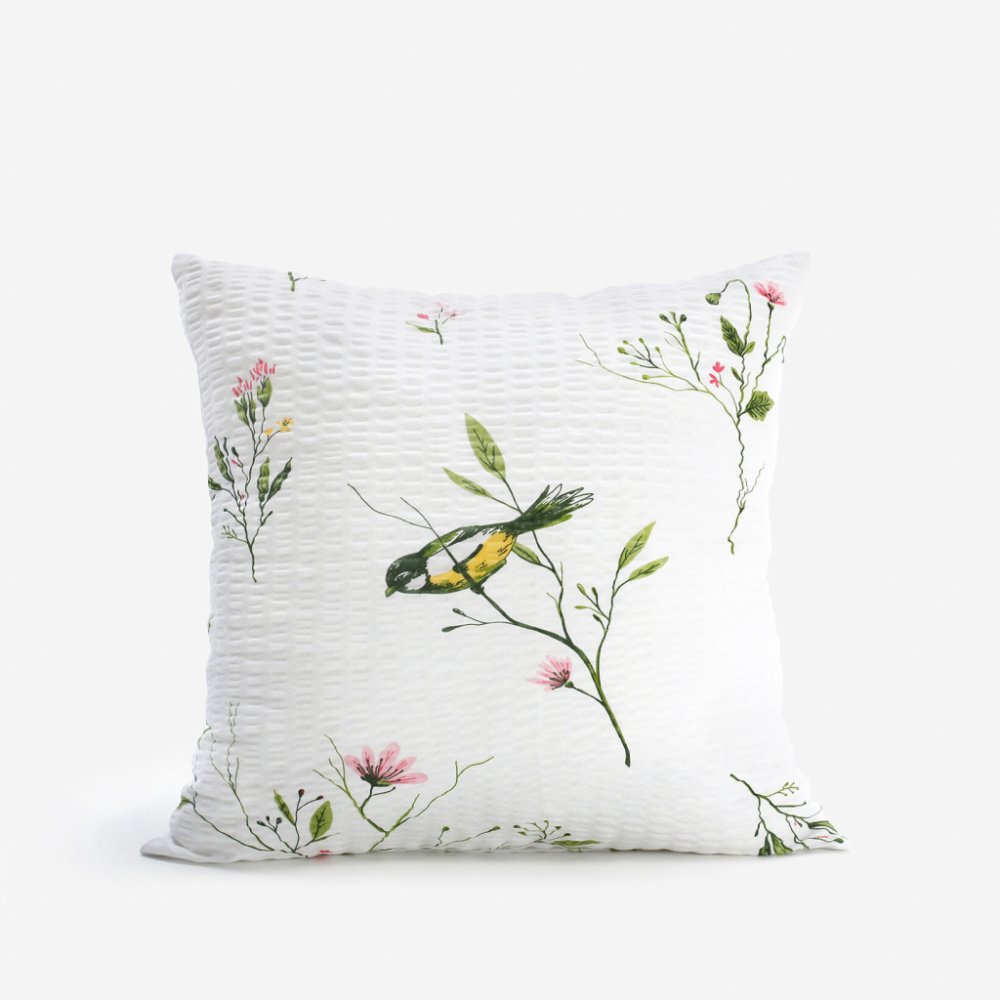Krepový povlak na polštář s jarním motivem lučního kvítí a sýkorek na bílém podkladu (z obou stran stejný motiv). Povlak je vyroben ze 100% měkčené bavlny. Je opatřen praktickým zapínáním na zip.
