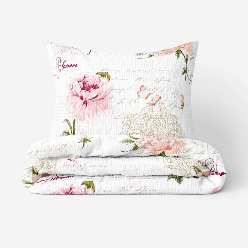 Vzor růžových pivoněk, motýlů, ornamentů a psaných textů promění vaši ložnici v místnost klidu a odpočinku. Doplňte si vaši ložnici o toto krepové povlečení. Podkladem povlečení je bílá barva.