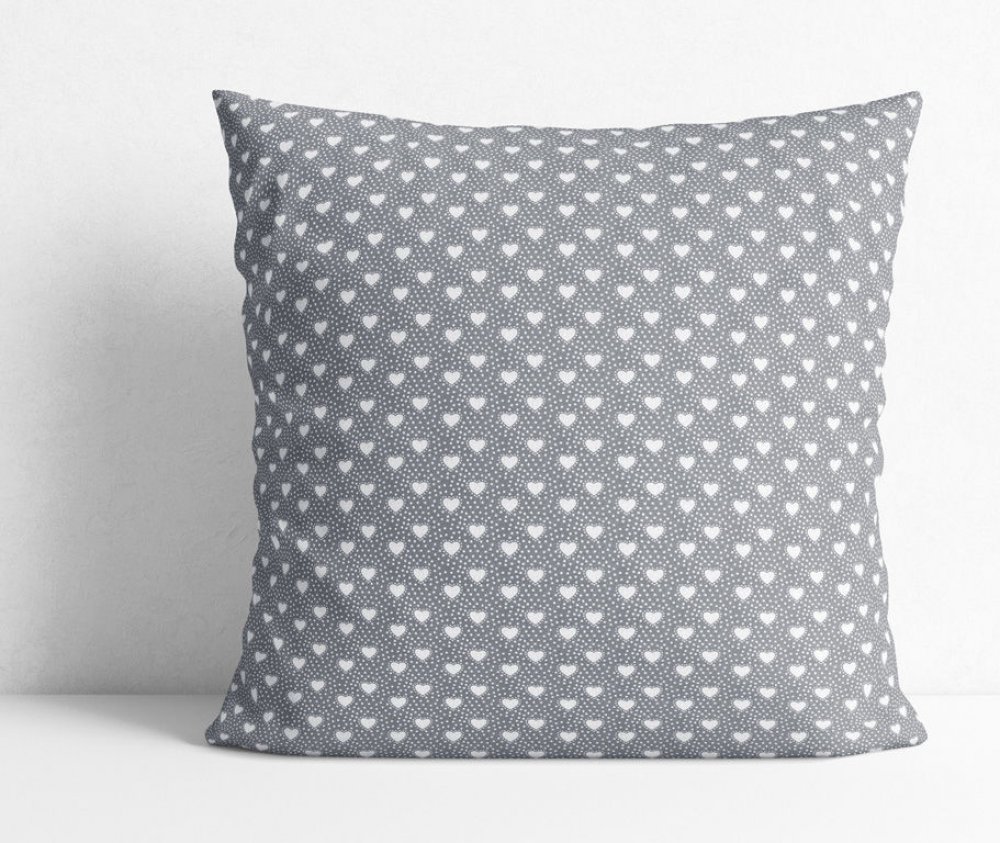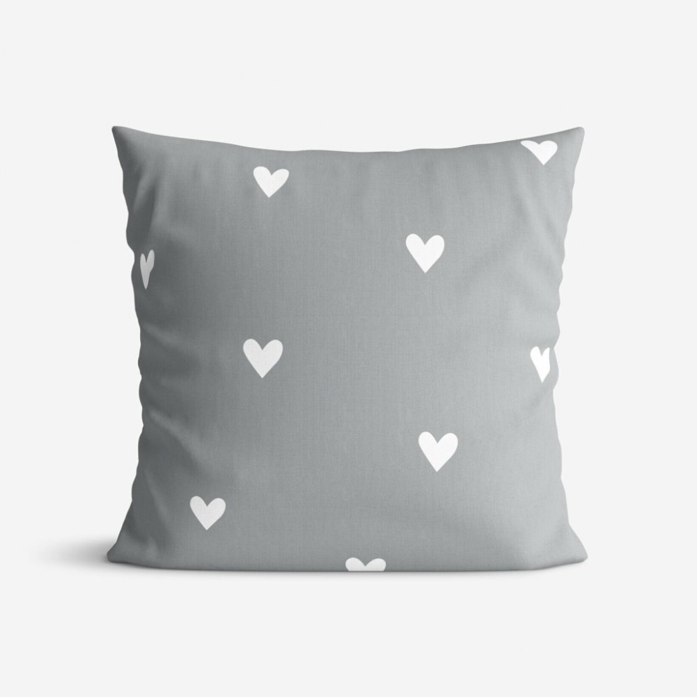 Bavlněný povlak na polštář s motivem bílých srdíček na šedém podkladu (z obou stran stejný motiv). Povlak je vyroben z kvalitní a příjemné 100% bavlny. Je opatřen praktickým zapínáním na zip. Možné prát na 40°C.