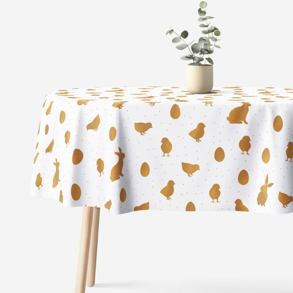 Bavlněný oválný ubrus s motivem zlatých velikonočních symbolů na bílém. Je vyrobený z velmi pevné 100% bavlny (gramáž 190g/m2). Ubrus velmi dobře drží tvar a hodí se na jakýkoliv oválný stůl. Ubrus s motivem zlatých velikonočních symbolů dokonale zkrášlí Váš interiér.