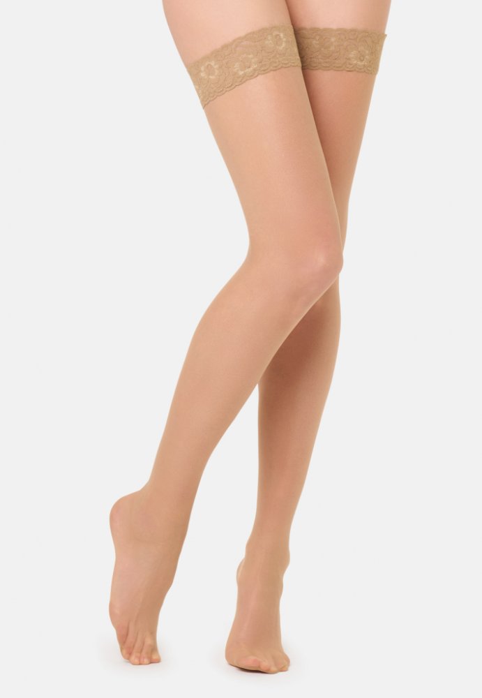 Průhledné samodržící punčochy v tělové barvě. Velmi jemné provedení. Ideální volba pro letní dny a společenské akce. Ozdobný krajkový lem se silikonovým páskem. Bez zesílené špičky. S označením kvality a nezávadnosti Oeko-Tex® Standard 100.