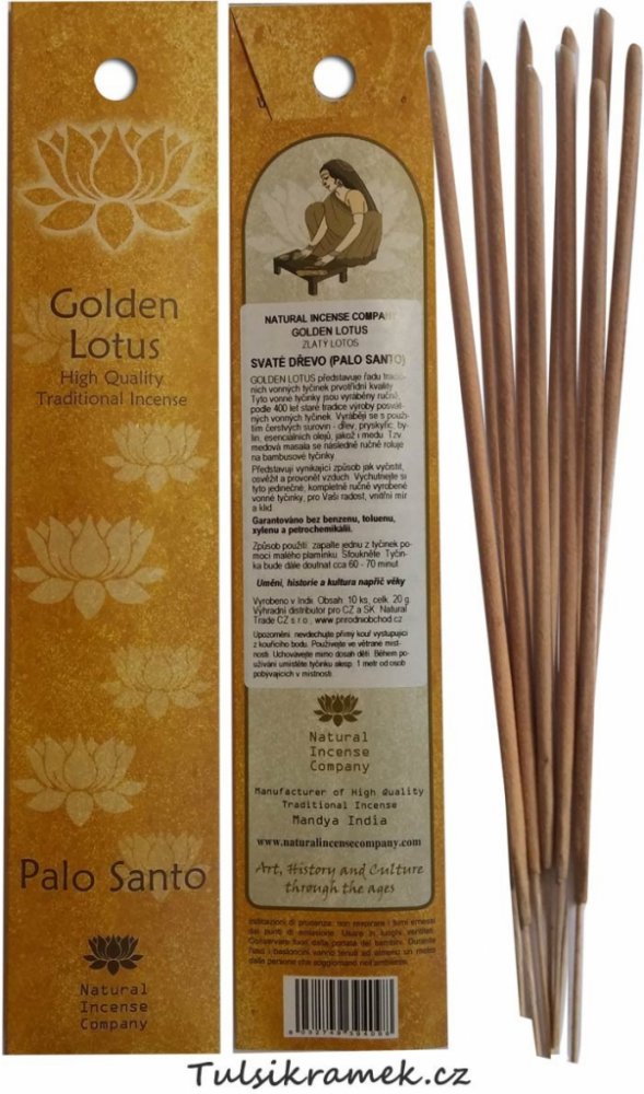 Vonné tyčinky GOLDEN LOTUS – svaté dřevo – jsou tradiční vonné tyčinky té nejlepší kvality. Vonné tyčinky GOLDEN LOTUS jsou vyráběny ručně, podle 400 let staré tradice výroby posvátných vonných tyčinek. Vyrábějí se pouze z čerstvých surovin – dřeva, pryskyřic, bylin, esenciálních olejů, medu. Tzv. medová masala se ručně roluje na bambusové tyčinky. Použití vonných tyčinek je vynikající způsob, jak vyčistit, osvěžit a provonět vzduch. GOLDEN LOTUS jsou jedinečné vonné tyčinky – kompletně ručně vyrobené – pro vaši radost, vnitřní mír a klid. Garantována výroba bez benzenu, toluenu, xylenu a petrochemikálií. Doba doutnání cca 60 až 70 minut. Složení Med, pryskyřice, byliny, éterické oleje, prášek z kokosového dřevěného uhlí, přírodní aroma, prášek ze vzácných dřev, bambusová tyčinka. Vyrobeno v Indii. Obsah: 10 ks, celkem 20 g.