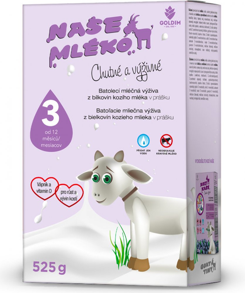 Prémiové batolecí kozí mléko NAŠE MLÉKO® 3 představuje novou generaci batolecích mlék nadstandardní kvality se zdravým kozím mlékem. NAŠE MLÉKO® 3 obsahuje optimalizované množství vitamínů, minerálů a mnoha dalších látek potřebných pro zdravý vývoj vašeho dítěte, s vysokým důrazem na správný růst kostí a vývin nervové soustavy právě od prvního roku života. Batolecí výživa NAŠE MLÉKO® 3 je plně adaptovaná pro potřeby batolat od 1. roku života a je zpracována za 100% dodržení nejpřísnějších hygienických a technologických podmínek výroby, které jsou pod stálou kontrolou státních orgánů. NAŠE MLÉKO 3 Bez bílkovin kravského mlékaMinimum alergenu αs1-kaseinuBlíže mléku mateřskémuSnadná stravitelnost i pro citlivá bříškaPřirozený obsah GOS a nukleotidůBez GMO a palmového olejeKvalitní jihočeská výroba Některé z předností kozího kojeneckého mléka NAŠE MLÉKO 3100% bez kravského mléka - Batolecí NAŠE MLÉKO® 3 vyrábíme z kvalitního plnotučného kozího mléka s garancí, že neobsahuje žádnou složku kravského původu.Snadná stravitelnost i pro citlivá bříška - Batolecí kozí mléko se v žaludku sráží do velmi jemných vloček. Vzniká tak měkčí trávenina, která snaze prochází trávicím traktem a nevede k zácpě či kolikám. Malé tukové částice se podobají uspořádání v mateřském mléce a také příznivě ovlivňují stravitelnost kozího mléka.Přirozený obsah GOS a nukleotidů - Batolecí kozí mléko obsahuje 5-10x vyšší množství nukleotidů a až 8x více oligosacharidů, než kravské mléko. Kozí mléko je výborným, přirozeným zdrojem těchto látek podporujících obranyschopnost organismu.Nízky alergenní potenciál kozího mléka vychází z nízkého zastoupení hlavních alergenů alfa-s1 kaseinu a β-laktoglobulinu, které jsou ve větší míře zastoupeny v kravském mléku a mohou vést u citlivých dětí k ABKM (alergii na bílkovinu kravského mléka).Bílkoviny - bílkovinný profil kozího mléka je podobný bílkovinám mateřského mléka, takže způsob i rychlost jejich trávení jsou u obou mlék obdobná.Tuky - tuk v kozím mléce je lépe stravitelný, malé tukové kapénky jsou jak svojí velikostí, tak svým rozmístěním podobné tuku mateřského mléka.Kozí mléko je bohaté na vysoce vstřebatelné, využitelné minerály - vápník, draslík, hořčík a fosfor. Čtěte dál a zjistěte více v přehledném článku VŠE O KOZÍM MLÉKU 100% Bez kravského mléka 100% Bez palmového oleje a GMO 100% Prémiová česká výroba Jak snadno přejít na Naše mléko?Ať už je váš důvod pro změnu kojeneckého mlíčka jakýkoliv, doporučujeme dodržovat následující pravidla, abyste svému miminku přechod na novou výživu co nejvíce usnadnili. Zároveň i vy si budete jistí, že váš drobeček nové mléko dobře toleruje a že mu chutná! Změna kojeneckého mléka by měla být co nejplynulejší a nejpohodlnější hlavně pro vaše miminko. Nespěchejte a změně mléka dejte cca 8 dní, možností, jak postupovat je několik.ZJISTĚTE VÍCE V PŘEHLEDNÉM ČLÁNKU Obsahové látky a složení prémiové kojenecké výživy NAŠE MLÉKO 3Vitamíny: vitamín A, D3, E, K1, C, B komplex (B1, B2, niacin, B6, kyselina listová, B12 a kyselina pantothenová).Minerální látky: draslík, chlor, vápník, fosfor, hořčík, železo, zinek, měď, mangan, selen, jód a sodík.Další nezbytné látky pro zdravý vývoj vašeho miminka v Našem mléku 3:omega-3 kyseliny: (DHA - dokosahexaenová kyselina a EPA - eikosapentaenová kyselina)omega-6 kyseliny: (ARA- kyselina arachidonová a esenciální nenasycené mastné kyseliny - NEMK)inositolcholinL-karnitintaurin GOS (přirozeně se vyskytující) a nukleotidy (přirozeně se vyskytující i fortifikované) Složení dle legislativních požadavků:plnotučné kozí mléko, fruktooligosacharidy, sušený glukózový sirup z kukuřice, kozí laktóza, syrovátkové proteiny kozího mléka, kukuřičný škrob, řepkový olej, slunečnicový olej, mléčnan vápenatý, emulgátor: řepkový lecitin, taurin, hydrogenuhličitan sodný, cholin, kyselina L-askorbová, nikotinamid, DL-alfa-tokoferyl-acetát, D-pantothenát vápenatý, riboflavin, pyridoxin-hydrochlorid, thiamin-mononitrát, kyselina listová, D-biotin, kyanokobalamin, nukleotidy (cytidin 5´-monofosforečnan, uridin 5´-monofosforečnan, adenosin 5´-monofosforečnan, inosin 5´-monofosforečnan, guanosin 5´-monofosforečnan), mléčnan železnatý, mléčnan zinečnatý, cholekalciferol, síran měďnatý, retinyl-palmitát, seleničitan sodný. Obsah balení: 525 gramů Návod na přípravu:90 ml převařené kojenecké vody a 15 g instantního prášku vytvoří 100 ml hotové tekuté výživy pro krmení z lahvičky. Jedna vrchovatá odměrka obsahuje průměrně 7,5 g instantního prášku. Vodu po převaření nechte chvíli vychladnout, nezalévejte batolecí mléko vroucí vodou. Doporučujeme pro míchání teplotu cca 50 ° C. Doporučené dávkování:Věk kojenceDenní dávka(orientační počet porcí)Množstvípřipravené výživyMnožství převařenévody na porciPočet zarovnanýchodměrek na porciod 12 měsíců2-3250 ml225 ml5Doporučená denní dávka připravené výživy je orientační. Přihlížejte k individuálním potřebám vašeho děťátka a doporučení dětského lékaře nebo odborníka z oblasti dětské výživy. ⚠️ Důležité upozornění: Nejlepší stravou pro vaše miminko je mateřské mléko. NAŠE MLÉKO 3 je vhodné pro výživu dětí starších dvanácti měsíců. Má být součástí smíšené a vyvážené stravy dítěte a nemá sloužit pro výživu dětí mladších než 12 měsíců. Recenze zákazníků z Heureky po zakoupení produktu: „Ideální pro děti s alergii na kravskou bílkovinu, lehce se rozpouští.” Ověře