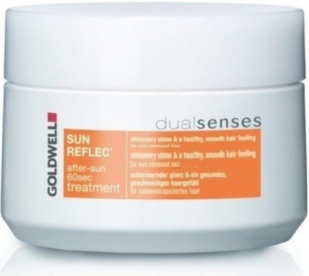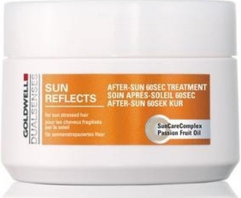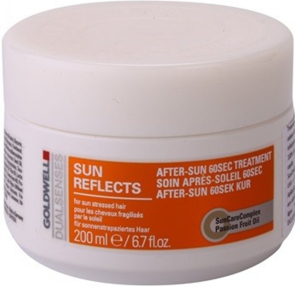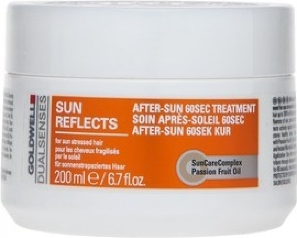 Goldwell DS Sun Reflects After Sun 60SEC maska pro vlasy namáhané sluncem. Po použití masky jsou vlasy regenerovány až o 100% během 60 sekund od účinků slunce, chlorované nebo slané vody. Aktivně zabraňují lámavosti vlasů. Navrací vlasům zdraví a lesk. Obsahuje SunCareComplex s olejem z marakuji, UVA a UVB filtry a Instat Microfluid Technology.