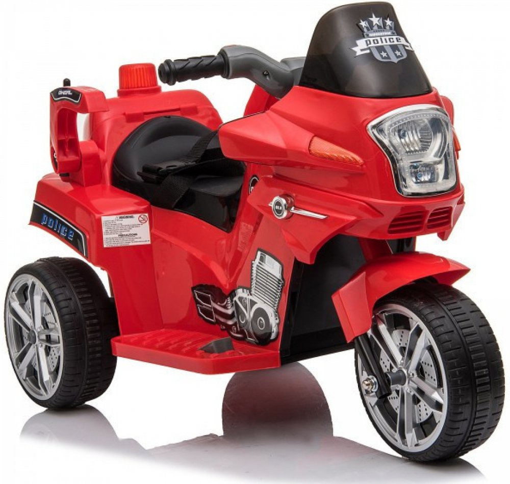 Elektrická motorka POLICE pro děti v moderním designu na dobíjecí akumulátor. Elektro motorka je vyrobena z odolných plastů, sedátko je velmi pohodlné a doplněné o dvě bezpečnostní sklopné opěrky. Se dvěma zadními koly je tento elektrický motocykl velmi stabilní. Motorce samozřejmě nechybí ani realistický zvuk motoru. Navíc má světla a zvuky a stisknutím tlačítka na řídítkách si můžete pustit hudbu. Ideální motorka pro malé motorkáře! Nejvyšší rychlost je 2,5 km/h. Po úplném nabití je možné jet nepřetržitě po dobu 45 minut.