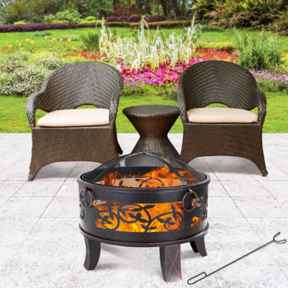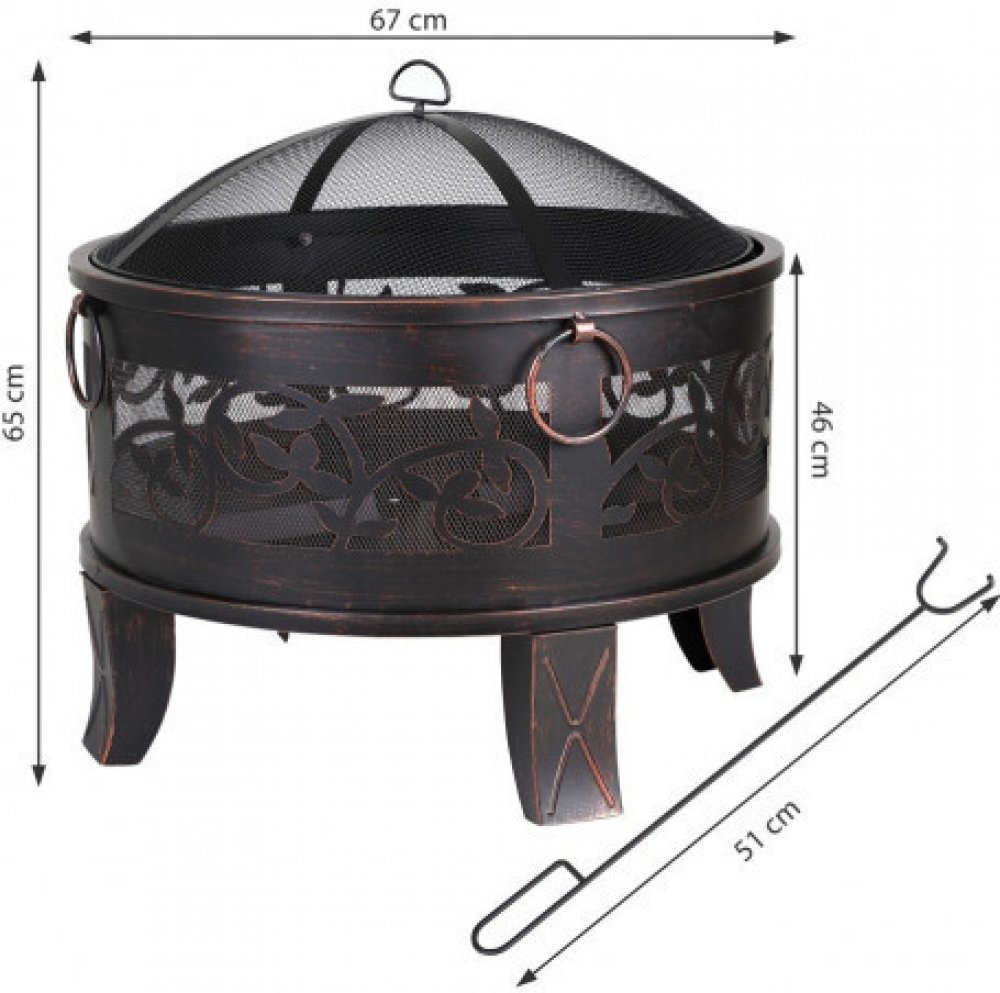 Elegantní miska na oheň s ochranou proti jiskrám, pohrabáčem a krytem - čistá relaxace u praskajícího ohně!Vychutnejte si příjemně hřejivou a útulnou atmosféru s tímto exkluzivním krbem. Ať už na zahradě nebo na terase - se zahradním krbem rychle vytvoříte útulné teplo.Velký kulatý ohnivý koš s elegantním a moderním designem v rezavém vzhledu upoutá pozornost. S trochou dřeva nebo uhlí vykouzlíte během chvilky hřejivý oheň, který přímo vybízí k posezení.Díky přiloženému chrániči proti jiskrám si můžete oheň v klidu vychutnat. Mimořádně praktický je také pohrabáč a vodoodpudivý PVC kryt, kterým můžete chránit terasové topidlo, když ho nepoužíváte.Miska na oheň i základní rámjsou vyrobeny z pevné, práškově lakované oceli. Díky robustním nožičkám se nemusíte obávat, že by se oheň převrhl.Výhody výrobkusoučástí je mřížka proti jiskrám, pohrabáč a kryt z PVCrobustní, práškově lakovaný materiálmoderní design roštuvysoká stabilita díky robustním nohámvelká kapacita4 kroužky na rukojeti pro snadnou přepravukombinuje design a vysokou funkčnostPodrobnosti o výrobkuRozměry (ØxV): 67x65cmRozměry spalovací komory (ØxV): 63x26cmHmotnost: 8,65 kgMateriál: ocel (práškově lakovaná)Barva: černá s bronzovými prvkyRozsah dodávky1x ohniště Ø67cm1x ochranná mřížka proti jiskrám1x pohrabáč1x kryt z PVC (vodoodpudivý)1x montážní návod a montážní materiálUpozornění: nepoužívejte v uzavřených místnostech! Elegantní zahradní ohniště vnese kouzelnou atmosféru hořícího ohně při posezení na Vaší zahradě nebo terase. Ohniště je dodáváno včetně krytu proti jiskrám, háku a odkapávací mísy. Antický designVyrobeno z vysoce kvalitního a odolného kovuKryt pro ochranu proti létání jisker pro větší bezpečnost4 úchyty pro snadný transport Technické parametry:Rozměry (bez držadla): 67 x 60 cmPrůměr: 67 cmVýška: 65 cmHmotnost: 8,65 kgMateriál: ocel