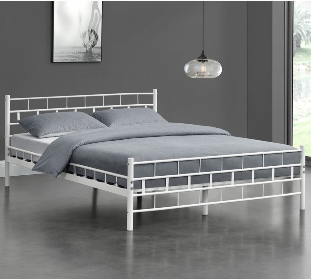 Kovová postel "Malta" v elegantní bílé barvě s robustní kovovou konstrukcí Vám zaručí klidné spaní. Díky velikosti 140 × 200 cm je postel vhodná pro jednu až dvě osoby. Geometrické vzory dávají posteli osobitý nádech. Rám má dlouhou životnost a je odolný vůči poškrábání a nárazům. Integrovaný roštový rám je výbornou podkladovou strukturou pro matraci podle vašeho výběru.