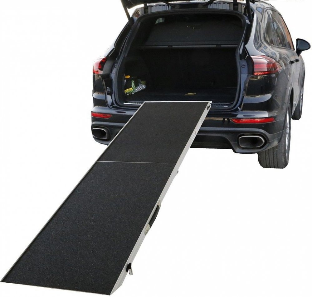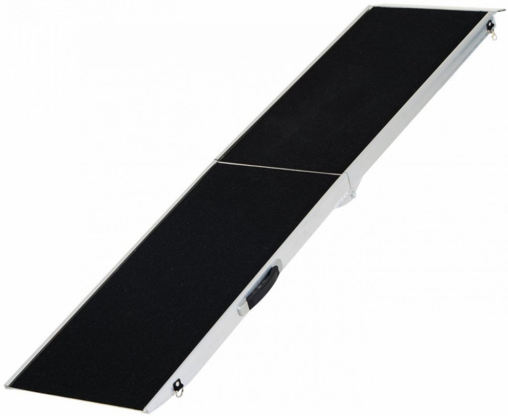 Skládací hliníková rampa pro snadný nástup psů do auta. Ideální pro špatně pohyblivé, nemocné nebo těžké psy. Maximální nosnost rampy je 150 kg, je opatřena protiskluzovým drsným povrchem a zvýšeným okrajem. Po jejím složení na polovinu ji lze snadno přepravovat v autě. rozměry rampy 183 x 38 cm rozměry ve složeném stavu 93 x 38 x 10 cm rampa je opatřena madlem pro snadné přenášení materiál hliník neklouzavý povrch z brusného papíru hmotnost 7 kg nosnost 150 kg