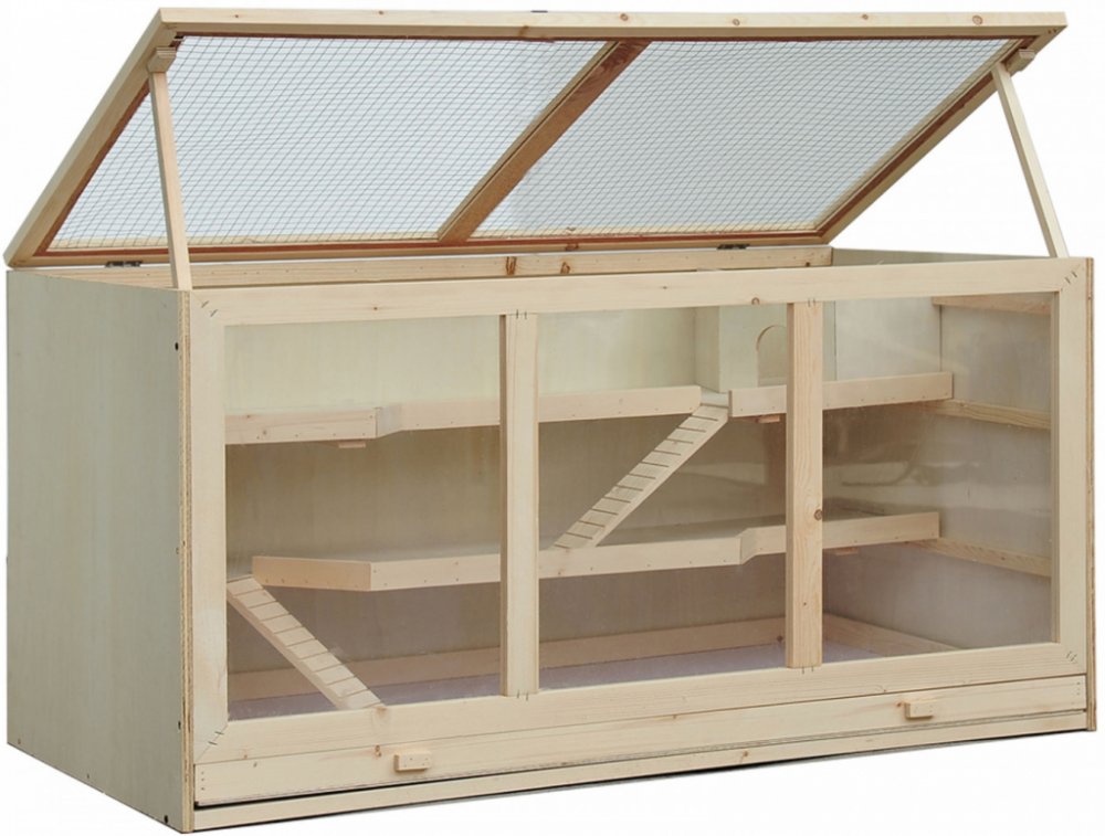 Naše vysoce kvalitní dřevěná klec pro křečky, myši nebo jiné drobné hlodavce. Zvířátka mohou přebíhat mezi jednotlivými úrovněmi po rampách. Klec je vybavena odklopnou stříškou.