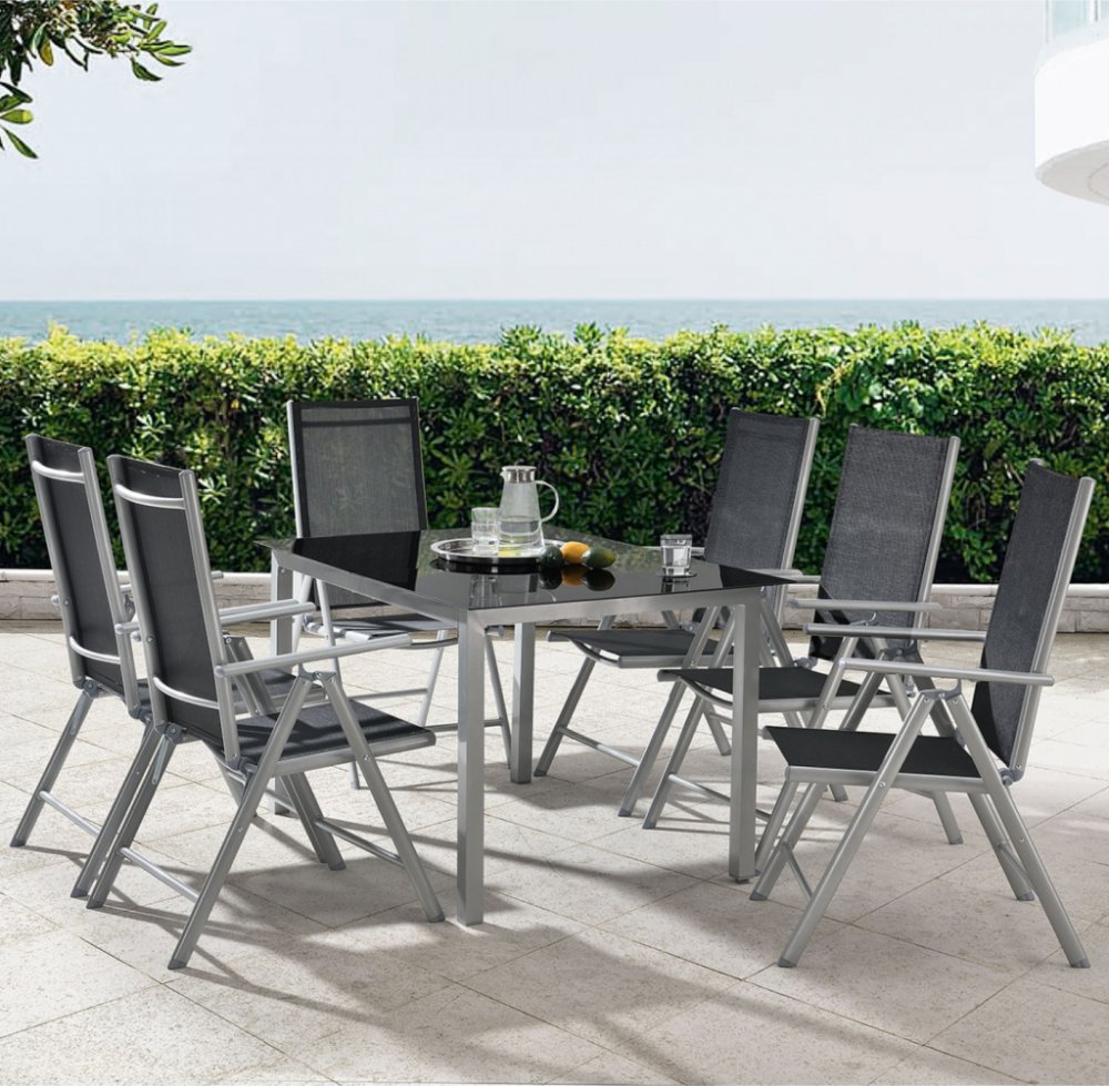 Hliníkový nábytek s dlouhou životností a s propracovaným designem Vás nadchne. Jednoduchá a střídmá elegance tvaru a barvy této zahradní sestavy najde své využití i v interiérech. Hliníková konstrukce stolu je v kontrastu s tmavou deskou stolu z bezpečnostního skla o tloušťce 5 mm. Židle s vysokým opěradlem je zhotovena z lehkého, ale pevného hliníkového profilu, který je povrchově ošetřen práškovým lakem. Sedák a opěrka je z textilenu. Zahradní židle se dá snadno složit jednoduchým zaklapnutím. Díky své nízké váze je celá tato zahradní sedací sestava snadno přemístitelná právě tam, kde ji zrovna potřebujete mít.