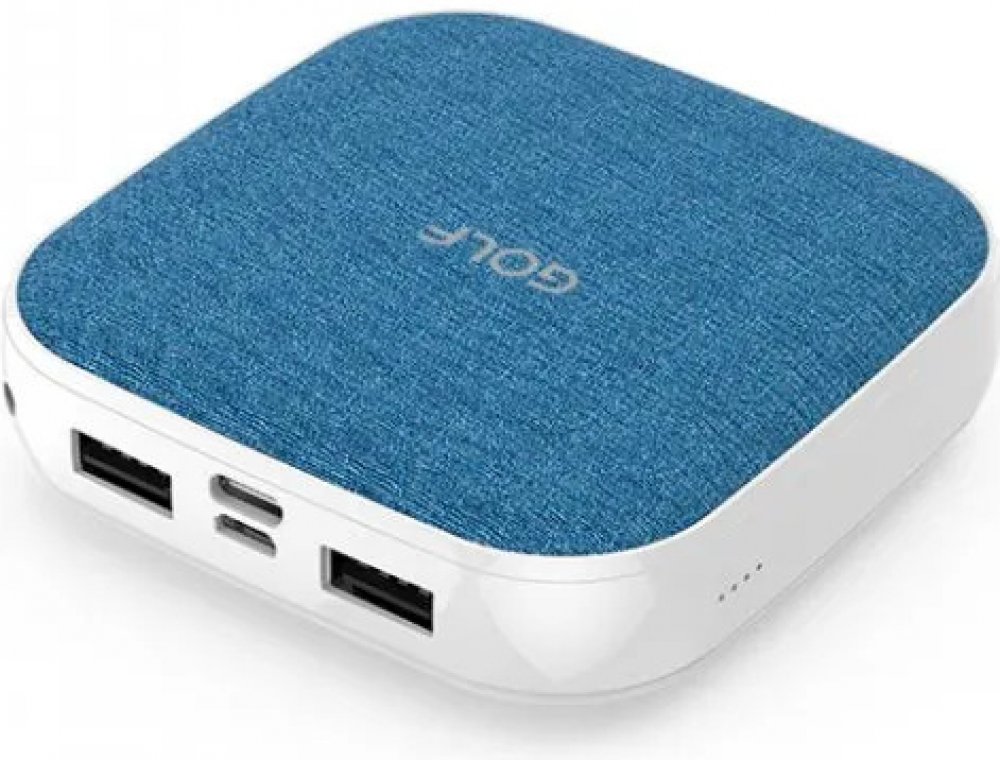 Golf G82 je powerbanka s textilním potahem, kapacitou 10 000 mAh a dvěma USB-A výstupy. První USB výstup nabízí maximální výkon 5 W a druhý 10 W. Pro nabíjení powerbanky jsou k dispozici vstupy micro USB a USB-C. O stavu nabití baterie vás budou informovat čtyři LED diody na boku.