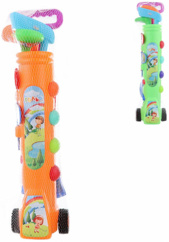 Dětský veselý barevný golfový set. Součástí lehký plastový vozík s obrázky, golfová hůl 3x, soft míček 4x, jamky, praporky a stojánky na míčky. 2 barevné varianty.