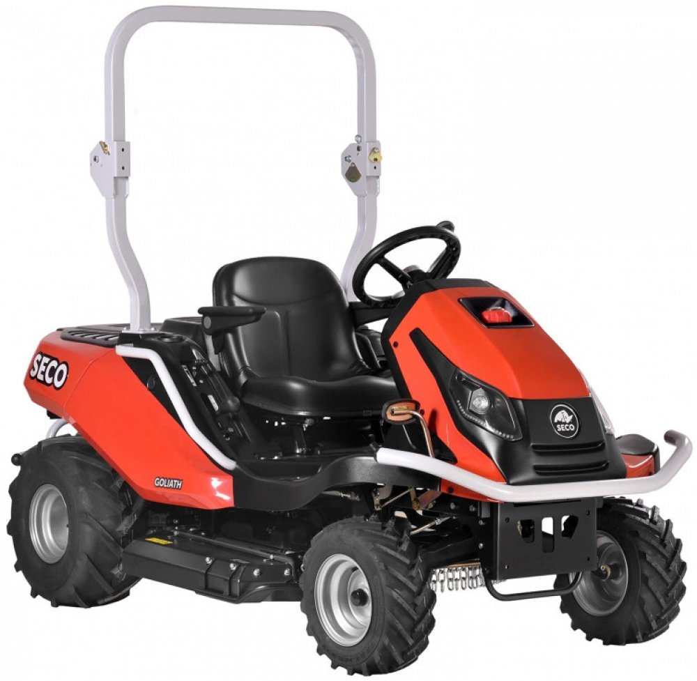 Díky profesionálnímu motoru Briggs & Stratton VANGUARD a profesionálnímu pohonu s mechanickou uzávěrkou diferenciálu je možné použití i v místech, kde jiný čtyřkolový traktor použít nelze. K profesionálnímu motoru má Goliath i profesionální převodovku s uzávěrkou diferenciálu. Standardem mulčeru Goliath je soustava první, která předurčuje stroj ke každodennímu užití: perfektní ergonomii pracoviště řidiče, veškeré potřebné ovládání na dosah ruky, seřiditelný sklon volantu doplněného o ovládací kouli, palivová nádrž o objemu 18 litrů (s ukazatelem i kontrolkou rezervy), komfortní sedadlo s opěrkami rukou a v neposlední řadě i multifunkční informační panel. Goliath je také jediným modelem v našem sortimentu, který je opatřen sklopným bezpečnostním rámem ROPS a zapínání žacího ústrojí pomocí elektromagnetické spojky s plynulým rozběhem "soft start". Informační panel zobrazuje všechny důležité informace. Stav zapnutí nebo vypnutí tempomatu, stav dobíjení akumulátoru, kontrolu mazání motoru, apod. Pro nejnáročnější podmínky je stroj ve standardní výbavě osazen profesionálním typem pneumatik. Jedná se o čtyř plátnový model se šípovým dezénem, který má v náročných podmínkách vynikající záběr. Použitím originálního příslušenství lze Goliath využít po celý rok. Můžete snadno připojit zadní závěs pro tažení sklopného vozíku. Po připojení předního závěsu můžete využít shrnovací radlici či sněhovou frézu. Foto je pouze ilustrativní, jedná se o traktor s pohonem zadních kol.