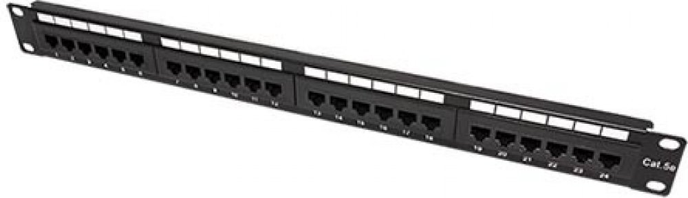 Nestíněný, 24-portový patchpanel kategorie 5e pro montáž do 19“ rozvaděče (výška 1U).;