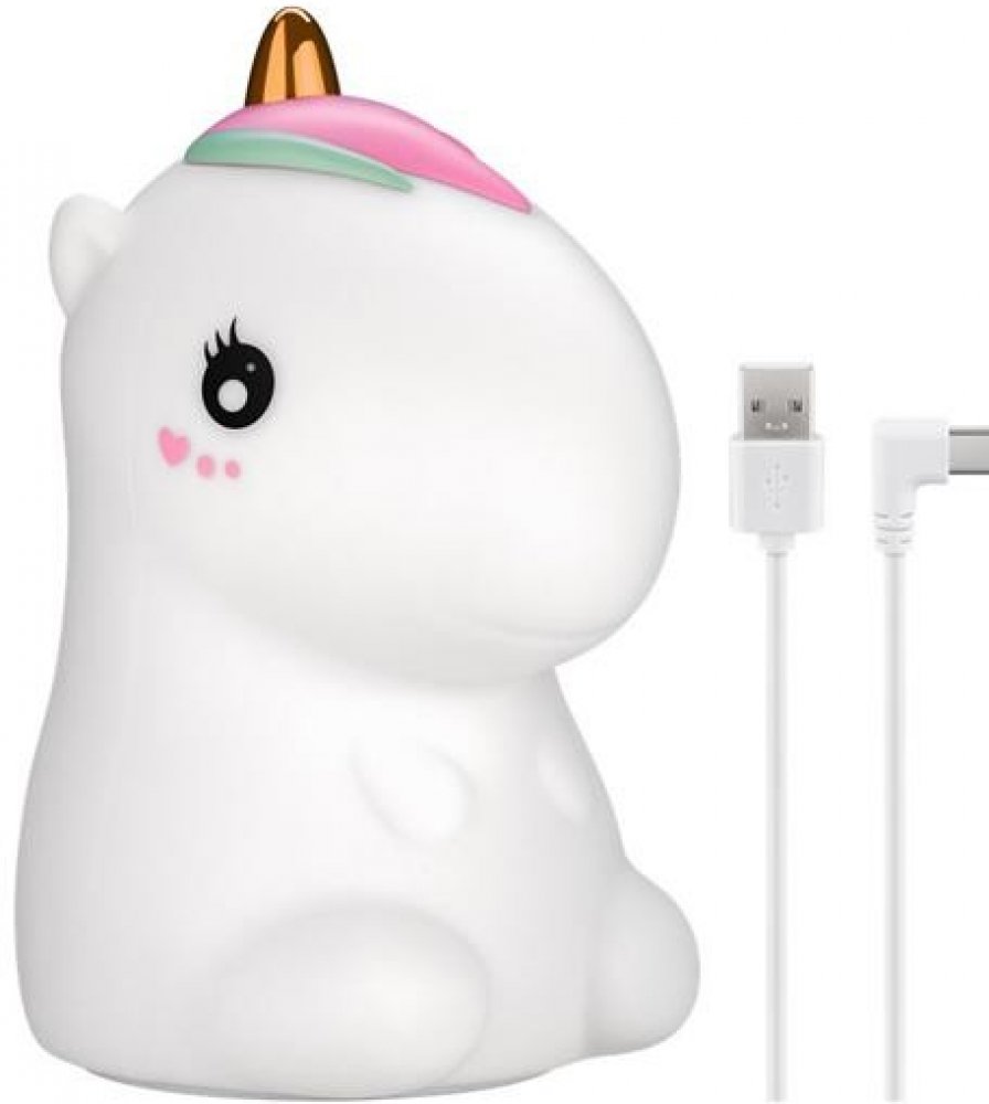 LED noční světlo Unicorn - Barevné, přenosné noční světlo pro děti (bez BPA) je ideálním společníkem v noci a při cestování. - Jednorožec se skvěle hodí jako pomůcka na spaní nebo noční světýlko pro miminko, jako světlo na kojení i jako dekorace do dětského pokoje. - Měkké LED světlo vytváří harmonickou atmosféru v ložnici a dětském pokoji. - 3 světelné režimy: 1. teplé bílé světlo, 2. jemná změna barvy mezi 7 nuancemi, 3. zvolená barva RGB svítí trvale - Dotykové ovládání přepíná mezi jednotlivými režimy svícení poklepáním na elastickou LED lampičku. - Bezdrátový provoz díky dobíjecí baterii a připojení USB-C™ (80 cm nabíjecí kabel USB-C™ na USB-A součástí dodávky), nabíjení 5 V, 1 A - Doba chodu noční lampy: RGB světlo 9 hodin, teplé bílé světlo 10 hodin, doba nabíjení: 3-4 hodiny. Technické parametry: - Lithium-iontová baterie (Li-ion) 18650 - max kapacita: 1200 mAh - napětí: 3,7 V - nabíjecí - zdroj světla: světelná dioda (LED) - jmenovitý světelný tok: 55 lm - max. doba svícení: 10 hodin - provozní napětí: 5V (DC) - počet LED diod: 8 - stupeň ochrany: IP20 - délka kabelu: 0,8 m - materiál: silikon, ABS - rozměr: 101 x 120 x 173 mm
