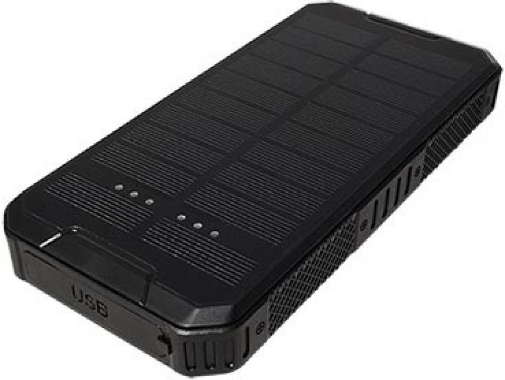 Záložní zdroj se svítilnou a solární nabíječkou pro mobilní zařízení.
