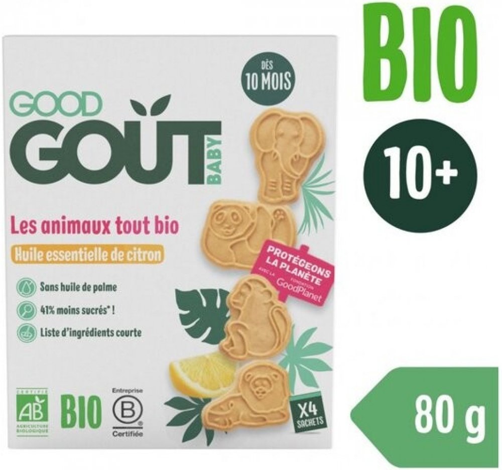 Good Gout BIO citrónové sušenky v podobě různých zvířátek jsou určené dětem od ukončeného 10. měsíce ideální svačinka vhodná na cesty nebo pro staršího sourozence do školy díky praktickému balení v pytlíčkách po pěti kusech se krásně vejdou i do menší kabelky vhodné pro děti, které již zvládají jíst kousky a mají alespoň 2 zoubky složení Bio pšeničná mouka (65,6 %), Bio koncentrát hroznové šťávy (...
