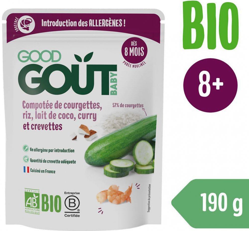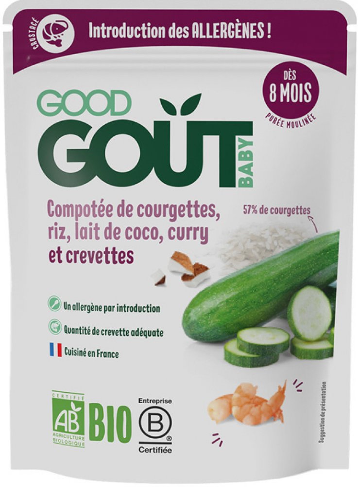 Složení: * cukety 57 %, voda z vaření, * bílá rýže 10 %, * KREVETY 8 %, * kokosové mléko (* kokos 65 %, voda) 5 %, * kari 0,15 %. *z ekologického zemědělství. Může obsahovat stopy CELERU. Alergeny označeny VELKÝM písmem.
