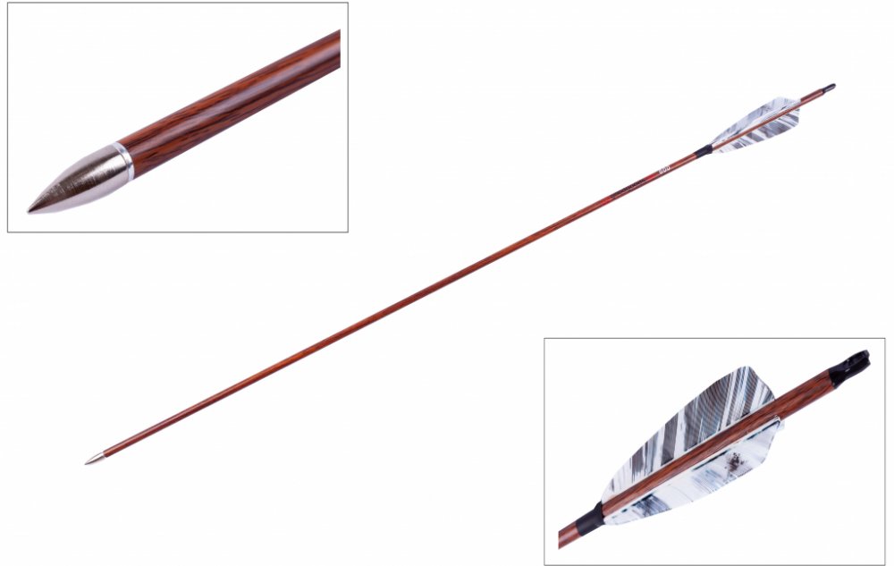 Kvalitní karbonový šíp do luku s výměnným hrotem délky 30", dřevěný dekor, spine 600, průměr šípu 7 mm. Bílé žíhané letky natural z krocaního peří. Šíp v barvě tmavého dřeva.