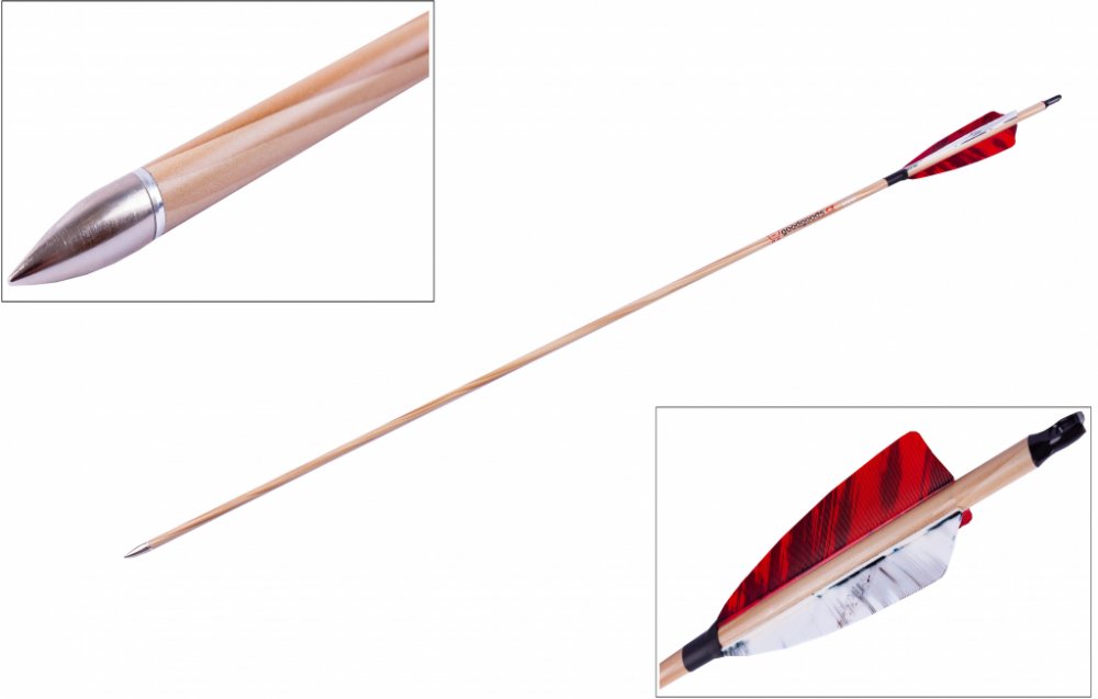Kvalitní karbonový šíp do luku s výměnným hrotem délky 30", dekor cedr, spine 600, průměr šípu 7 mm. Červené žíhané letky natural z krocaního peří. Šíp v barvě světlého dřeva.