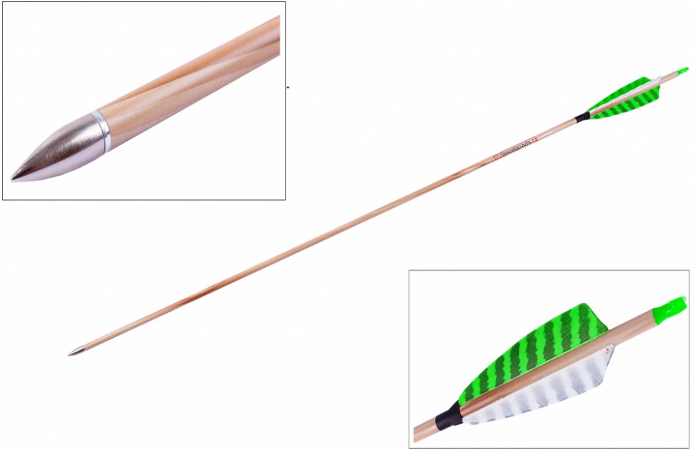 Kvalitní karbonový šíp do luku s výměnným hrotem délky 28", dekor cedr, spine 600, průměr šípu 7 mm. Zelené pruhované letky natural z krocaního peří. Šíp v barvě světlého dřeva.