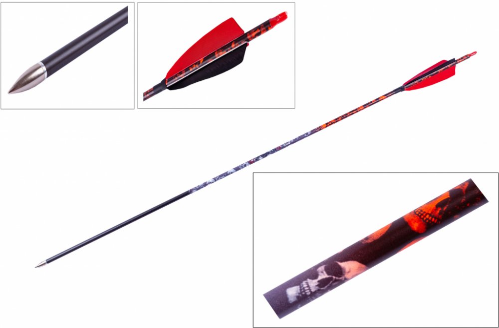 Kvalitní karbonový šíp do luku s výměnným hrotem délky 32", dekor lebky, spine 600, průměr šípu 7 mm. červené letky natural z krocaního peří. Šíp v atraktivním vzhledu s lebkami.